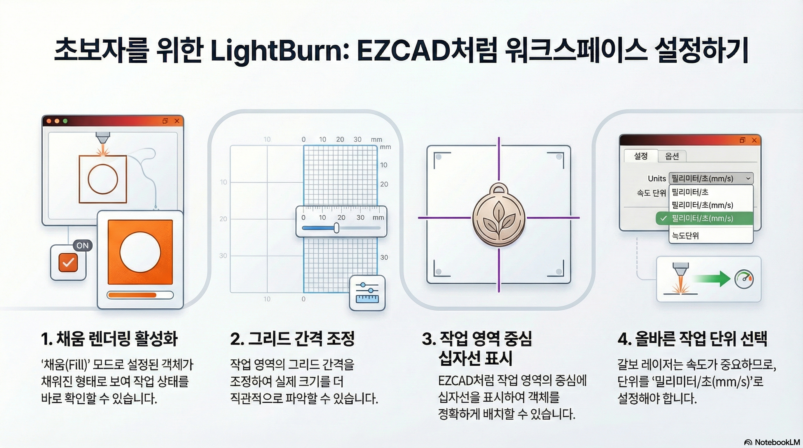 EzCad 환경에서 막 LightBurn으로 넘어오셨다면, 처음 마주한 작업 공간이 마치 외계처럼 낯설고 이질적으로 느껴질 수 있습니다. 익숙했던 모든 것이 조금씩 달라 당황스러울 수 있죠. 하지만 걱정하지 마세요. 몇 가지 간단한 설정 변경만으로도 이 생소한 공간을 EzCad처럼 친숙하고 강력한 작업 환경으로 완전히 탈바꿈시킬 수 있습니다.