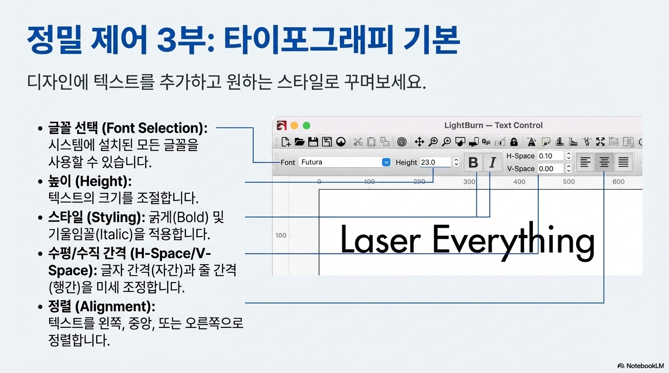 지금까지 살펴본 것처럼 LightBurn은 단순히 레이저 헤드를 움직이는 명령을 내리는 소프트웨어가 아닙니다. 많은 경우, 외부 편집 프로그램을 켜는 수고를 덜어줄 만큼 강력하고 실용적인 디자인 편집 기능을 품고 있는 훌륭한 파트너입니다. 겹치는 글자를 하나로 합치는 '용접' 기능부터, 정밀한 위치 조정을 돕는 '앵커 포인트', 그리고 복잡한 도형을 만들고 복제하는 '불리언 연산'과 '배열' 기능까지, 이 모든 것이 LightBurn을 단순한 제어 프로그램을 넘어선 강력한 디자인 도구로 만들어 줍니다.
