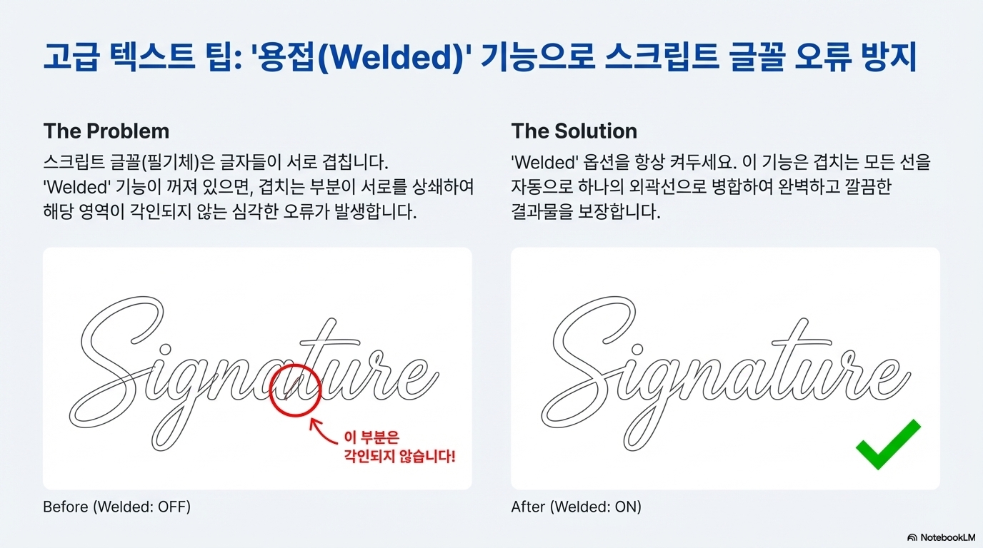 실전 활용 팁: 이 기능은 단순히 각인할 때만 유용한 것이 아닙니다. 특히 나무나 아크릴로 글자 커팅을 할 때 결정적인 역할을 합니다. 만약 '용접' 기능을 끄고 필기체를 자르면, 글자들이 겹치는 부분마다 불필요한 내부 커팅 라인이 생겨 조각이 나 버리거나 디자인이 망가지는 결과를 초래합니다. '용접' 기능은 이러한 문제를 완벽하게 방지해 줍니다.