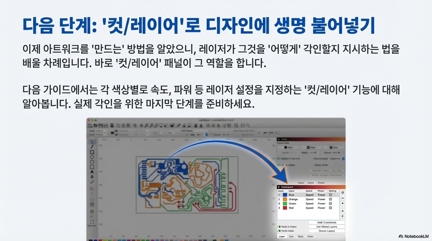 물론 복잡한 일러스트레이션 작업에는 여전히 전문 디자인 프로그램이 필요할 것입니다. 하지만 간단한 수정이나 배열, 도형 조합 같은 일상적인 작업이라면, 이제 외부 프로그램을 켜기 전에 LightBurn의 도구 모음을 먼저 살펴보는 것은 어떨까요? 여러분이 매일 사용하는 LightBurn에는 아직 발견하지 못한 놀라운 기능이 더 많이 숨어있을지도 모릅니다.