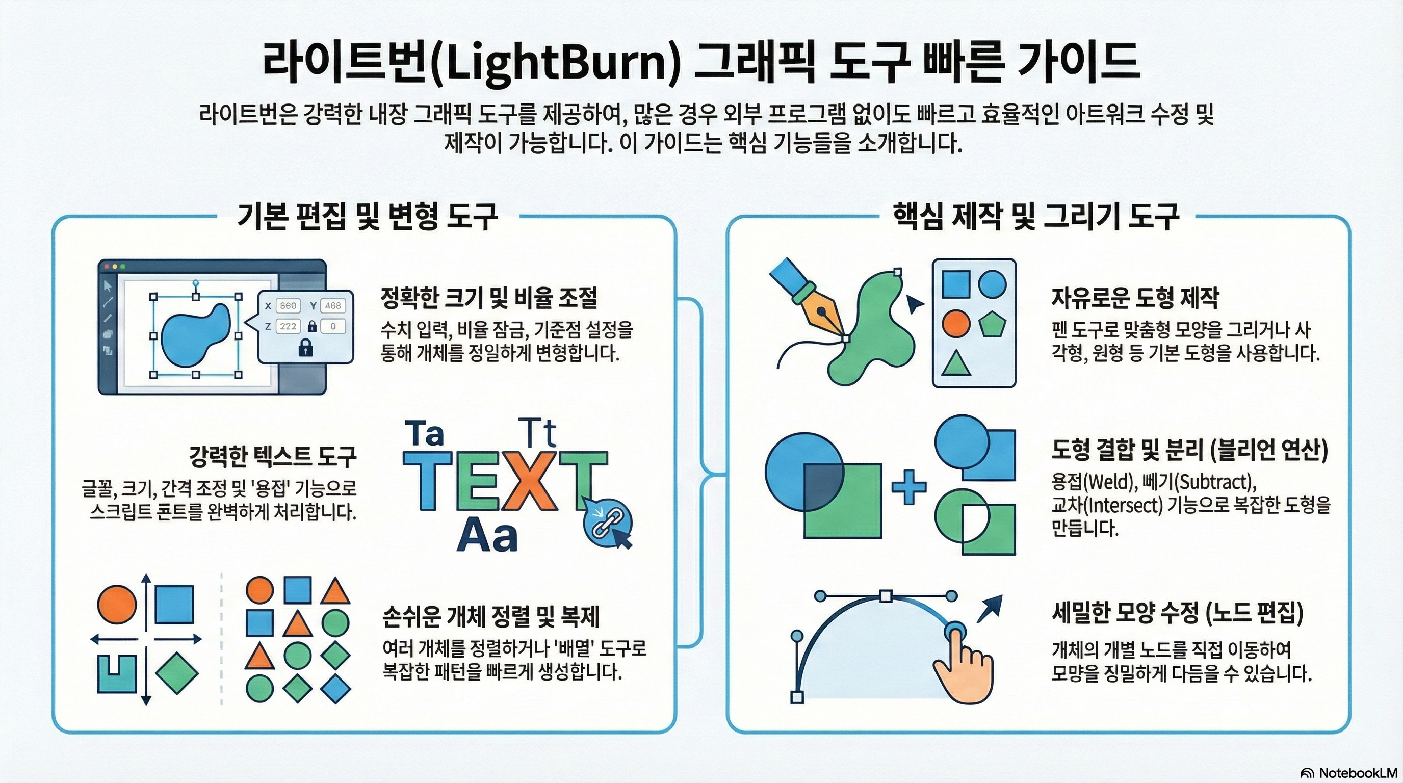 복잡한 도형을 만들거나 여러 개의 디자인을 한 번에 배치하는 작업은 전문 벡터 편집 프로그램의 전유물이라고 생각하기 쉽습니다. 하지만 LightBurn은 이러한 핵심적인 디자인 기능들을 모두 갖추고 있습니다.