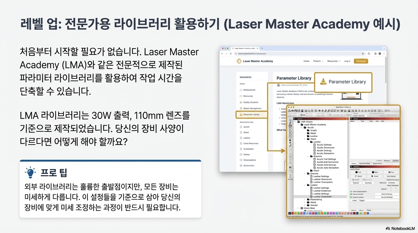 'Laser Params Converter'는 단순히 내 Ezcad 라이브러리를 변환하는 1회성 도구가 아닙니다. Laser Master Academy(LMA)에서 제공하는 전문 라이브러리나 온라인에서 구한 다른 사용자의 라이브러리를 내 장비에 맞게 변환하는 데에도 매우 강력한 성능을 발휘합니다.