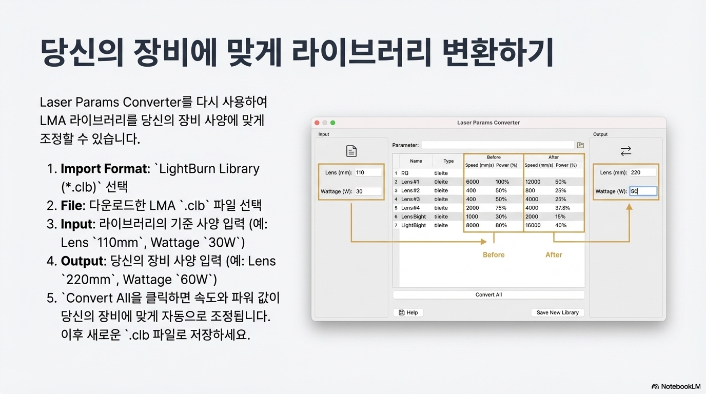 - 가장 중요한 단계: 이제 원본 라이브러리가 만들어진 장비의 렌즈 크기(예: 110mm)와 레이저 와트(예: 30W)를 'Input' 섹션에 정확하게 입력해야 합니다. 이 정보가 없으면 변환기는 파라미터를 올바르게 해석할 수 없습니다.