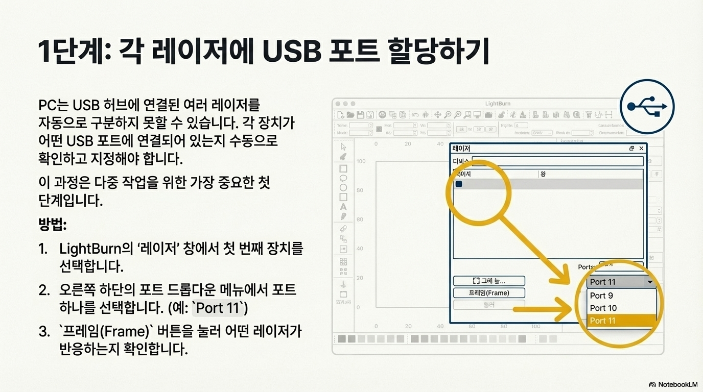 여러 대의 레이저를 동시에 실행하기 전에 반드시 선행되어야 할 중요한 단계가 있습니다. 바로 각 레이저가 어떤 USB 포트에 연결되어 있는지 LightBurn에 명확히 알려주는 것입니다. 그렇지 않으면 소프트웨어가 혼란을 겪을 수 있습니다. 특히 여러 장비를 USB 허브에 연결하여 사용하는 경우, 소프트웨어가 각 포트를 구분하는 데 혼란을 겪는 경우가 많으므로 이 과정이 더욱 중요합니다.