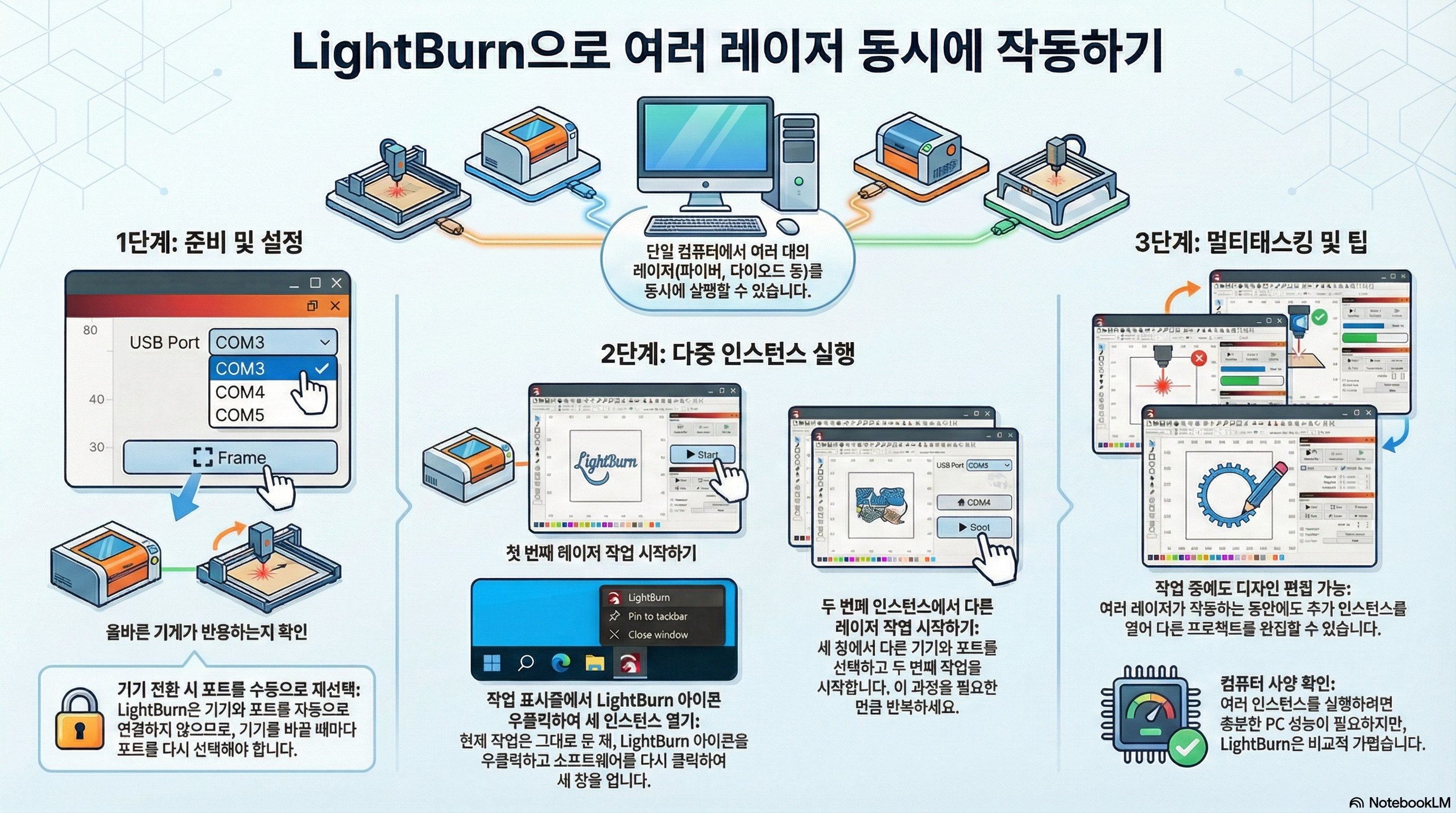 핵심 개념은 LightBurn 프로그램을 여러 개 실행하는 '다중 인스턴스(multiple instances)'입니다. 이는 별도의 컴퓨터가 필요한 것이 아니라, 현재 사용 중인 컴퓨터에서 간단하게 실행할 수 있습니다.