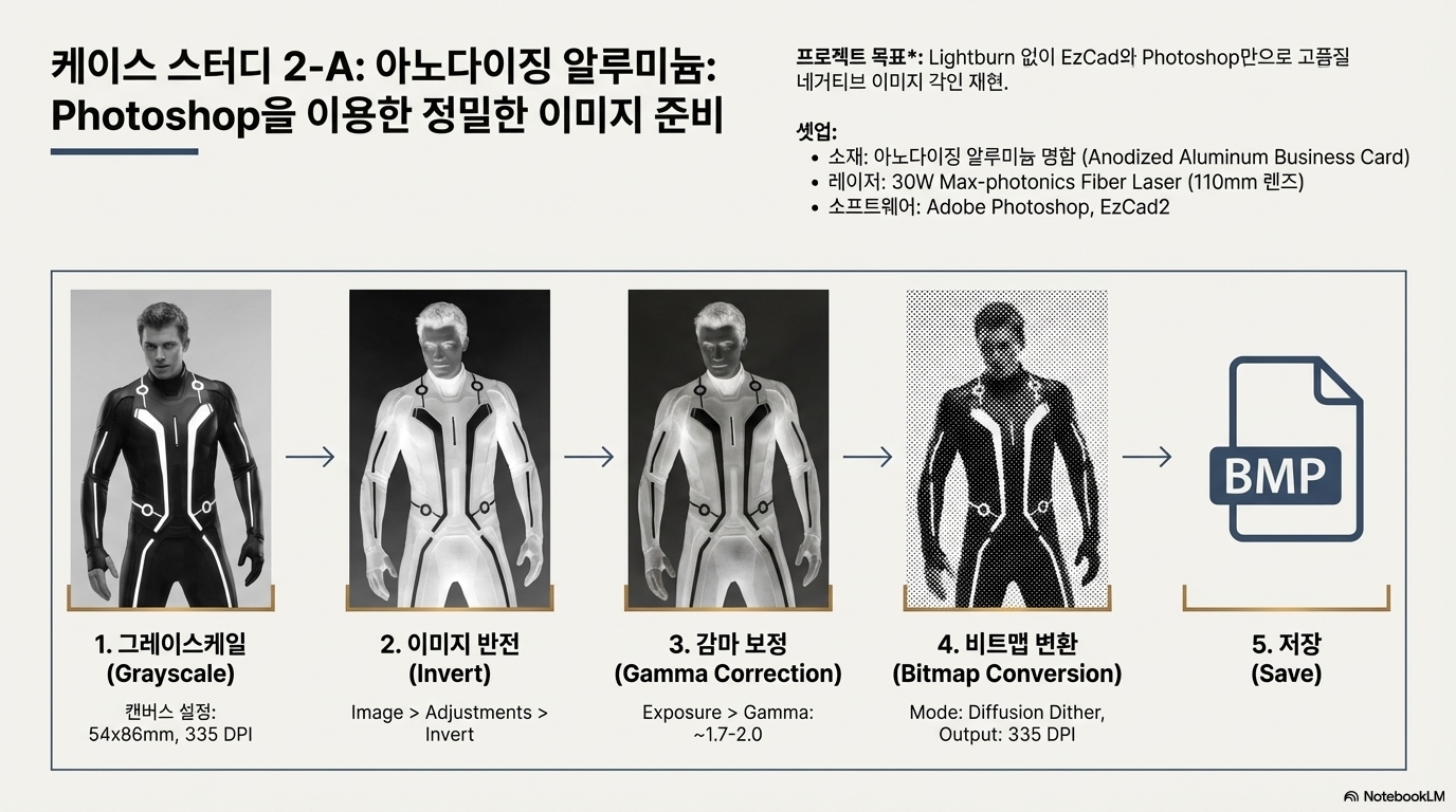 아노다이징 알루미늄 명함에 '트론(Tron)' 이미지를 각인하는 사례가 이 원리를 완벽하게 보여줍니다. 이 작업의 핵심 논리는 다음과 같습니다.
