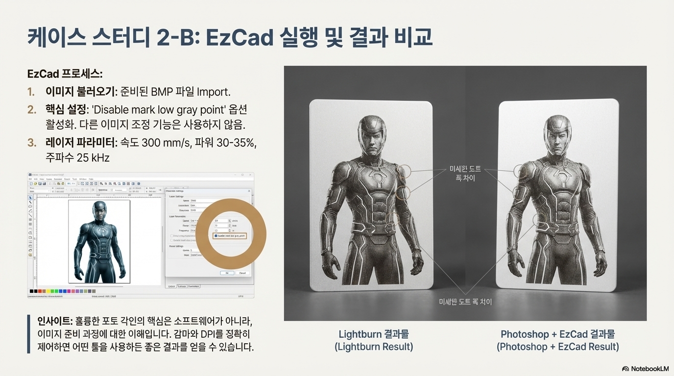 - 실행 계획: 포토샵에서 이미지를 반전시키고, 새로운 '흰색 마킹' 논리에 맞춰 감마를 재조정한 뒤, 레이저 소프트웨어에서 흰색 마감 설정을 선택하여 다시 시도한다.