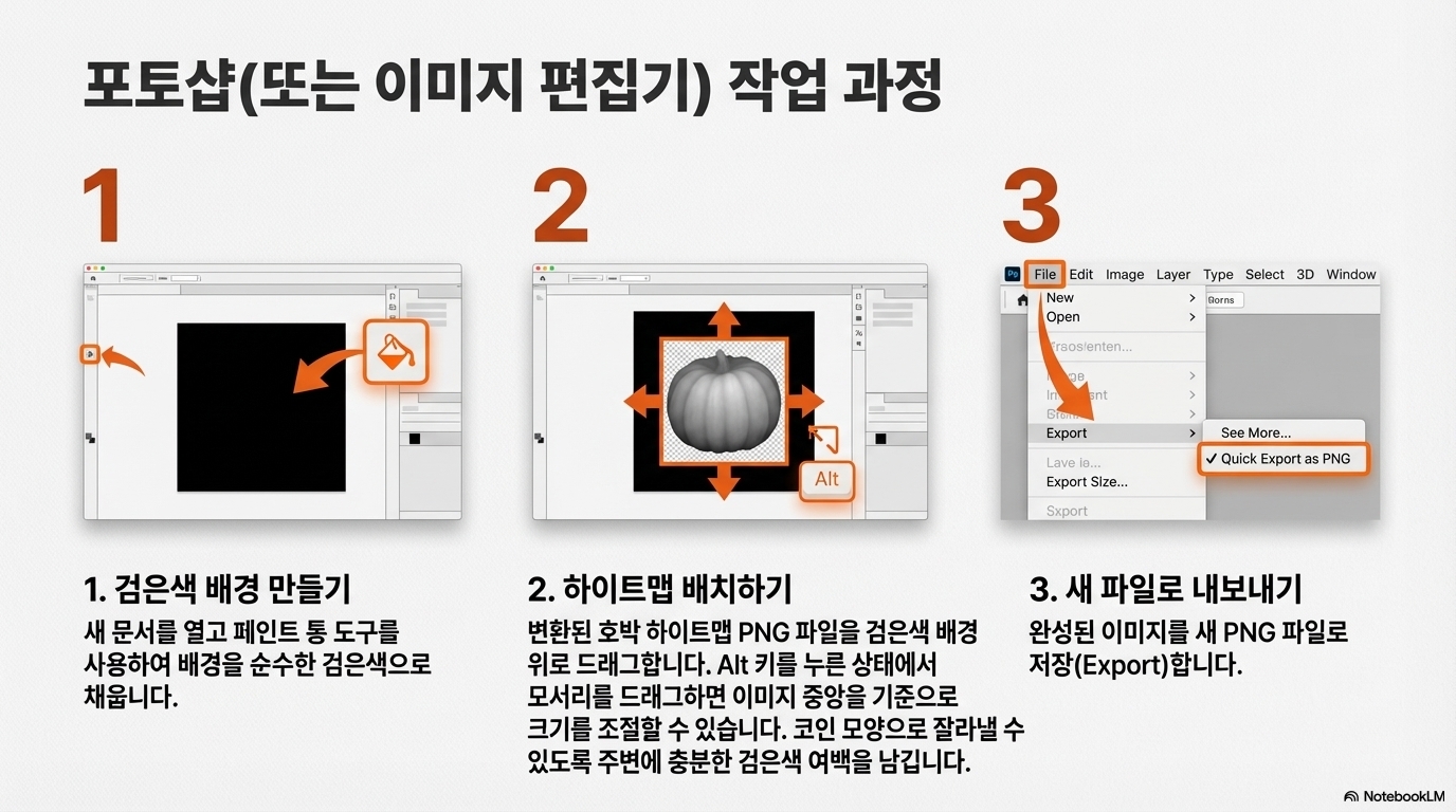 1단계 (외부 편집기): 포토샵과 같은 이미지 편집 프로그램을 사용하여, 생성된 높이 지도 이미지를 더 큰 순흑색 배경 위에 배치합니다. 여기서 순흑색 배경을 사용하는 이유는 높이 지도에서 검은색이 가장 깊게 각인될 최하단 지점을 의미하기 때문입니다. 이렇게 하면 '쿠키 커터'로 잘라낼 바깥 영역이 디자인의 가장 깊은 부분과 동일한 깊이로 깔끔하게 정리됩니다. 이 파일을 새 이미지로 저장합니다.