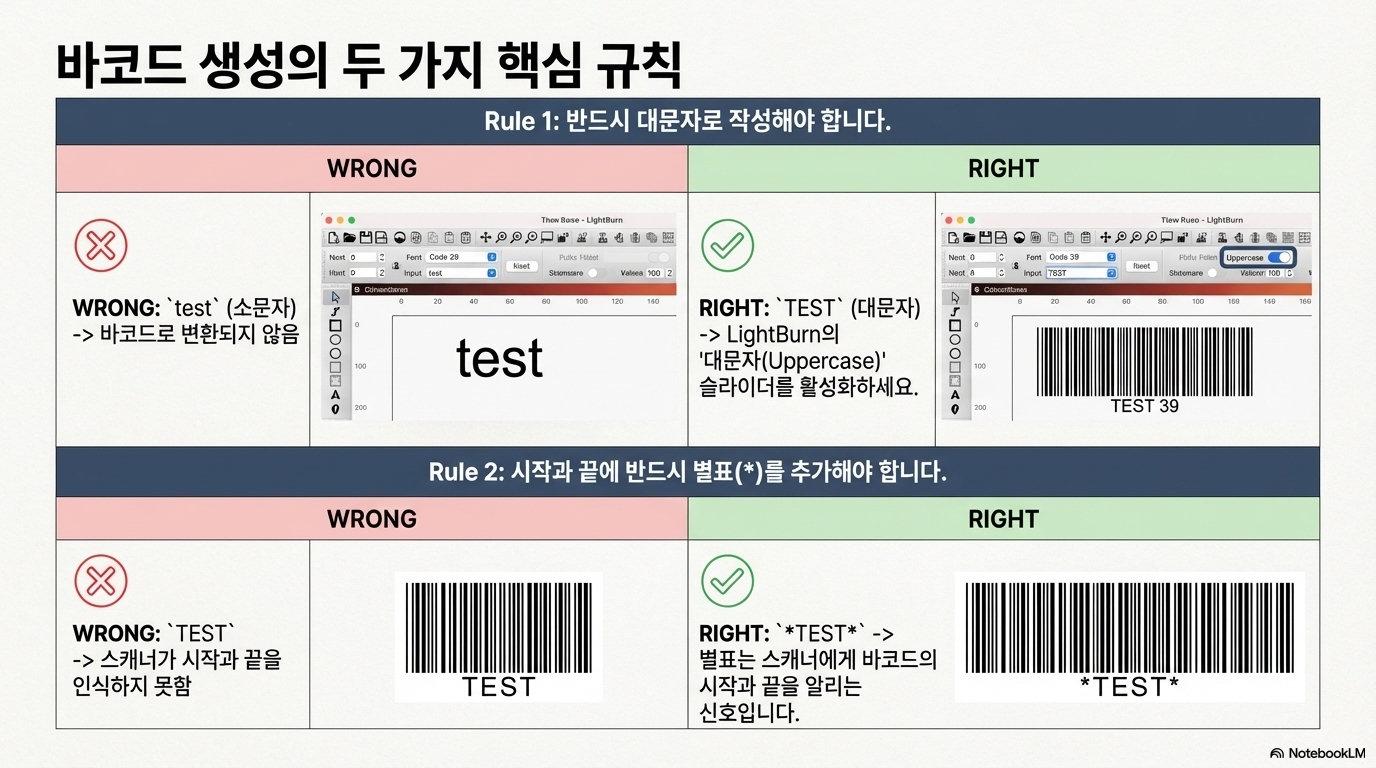QR 코드와 달리, 라이트번에서 스캔 가능한 바코드를 만드는 데는 대부분의 사용자가 모르는 두 가지 '비밀 수칙'이 있습니다. 이 규칙들은 특히 Code 39 바코드 형식을 생성할 때 반드시 지켜야 하며, 따르지 않을 경우 바코드는 절대 스캐너에서 인식되지 않습니다.