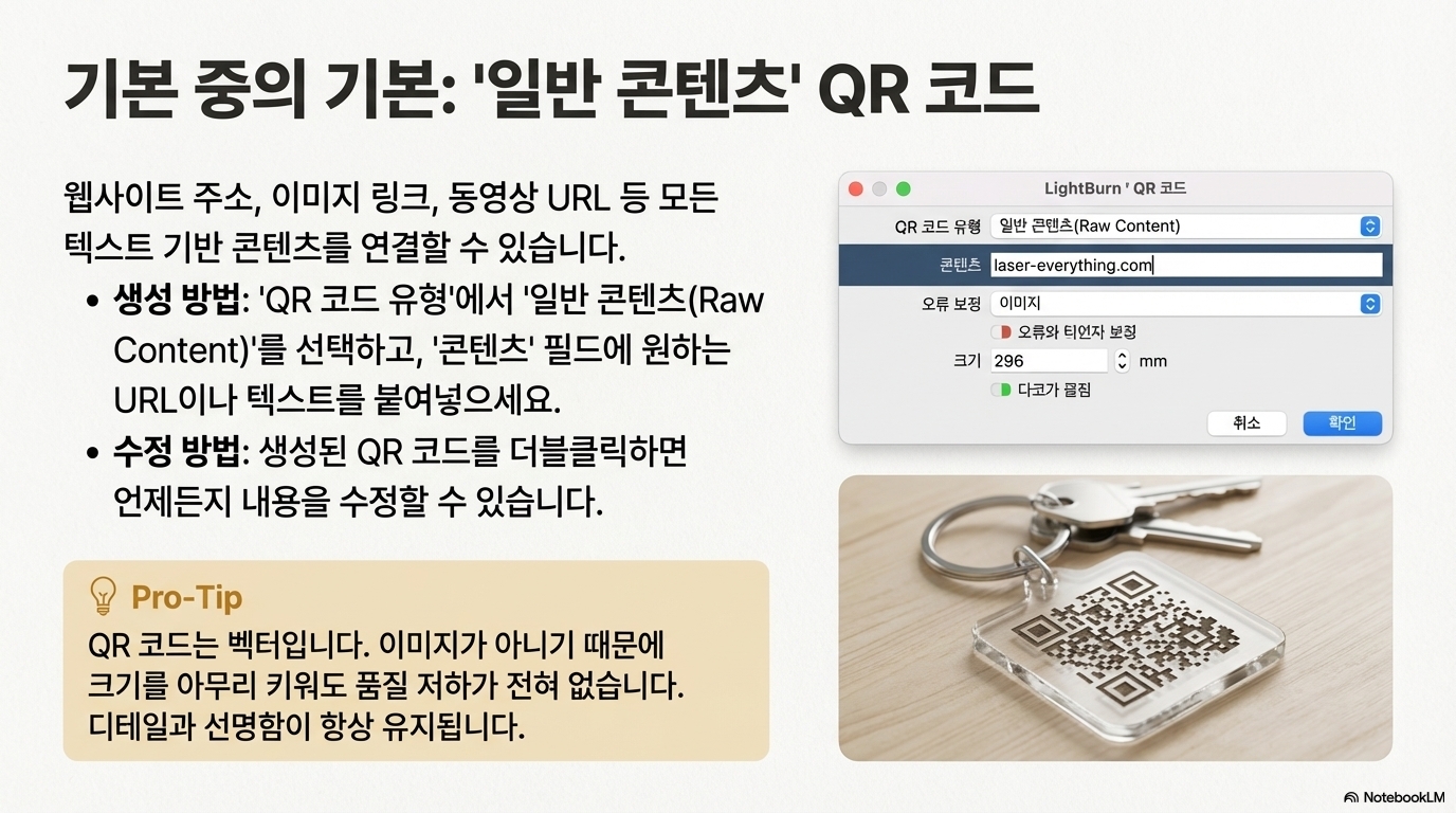 이것이 왜 중요할까요? 벡터 그래픽의 가장 큰 장점은 크기를 아무리 조절해도 품질이 전혀 손상되지 않는다는 점입니다. 말 그대로 달까지라도 크기를 키울 수 있을 정도로, 어떤 크기로든 QR 코드의 크기를 키우거나 줄여도 모든 선과 점은 깨짐 없이 선명하게 유지됩니다. 이는 다양한 크기의 제품에 정밀한 각인이 필수적인 레이저 작업에서 결정적인 이점을 제공합니다.