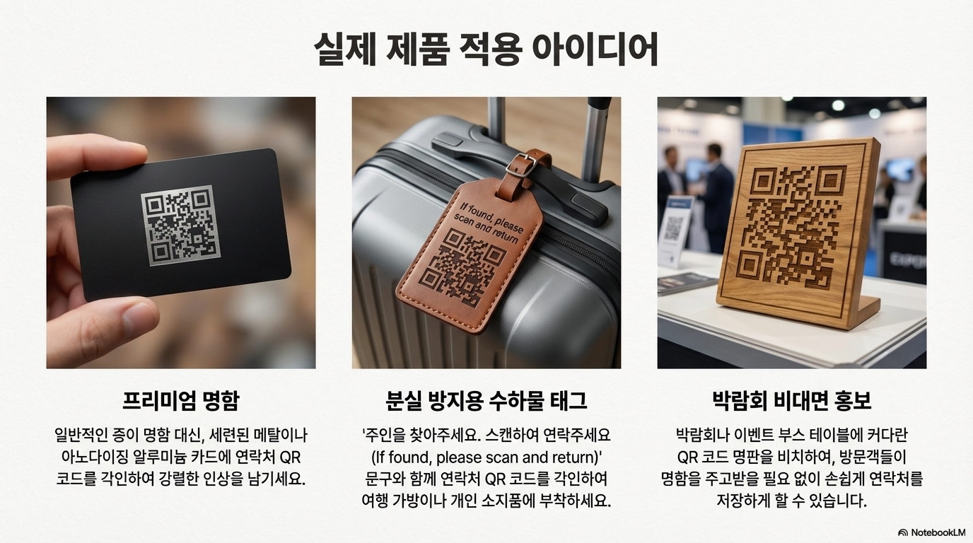 - 박람회 부스: 거대한 안내판에 QR 코드를 각인해두면, 방문객들이 손쉽게 여러분의 연락처를 저장하고 돌아갈 수 있습니다.