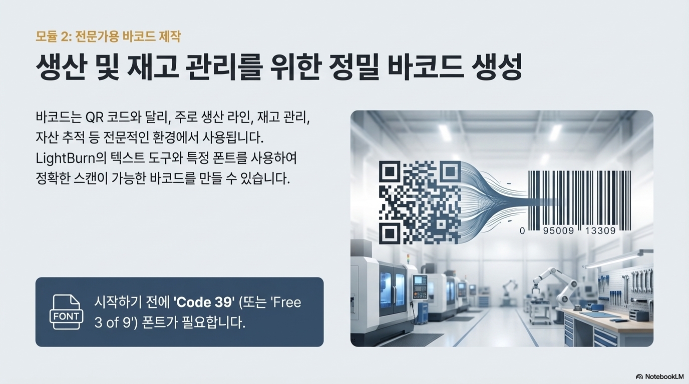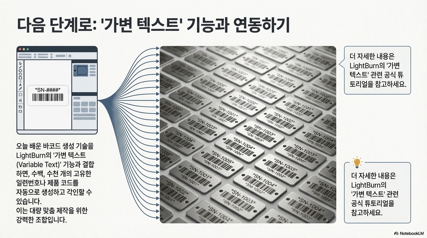 이 두 가지 간단한 규칙만 기억한다면, 재고 관리나 제품 식별용 바코드를 손쉽게 제작하고 각인할 수 있습니다. 더 나아가, 이 기능을 라이트번의 '가변 텍스트(Variable Text)' 기능과 결합하면 제품 일련번호를 자동으로 생성하는 고급 작업도 가능합니다.