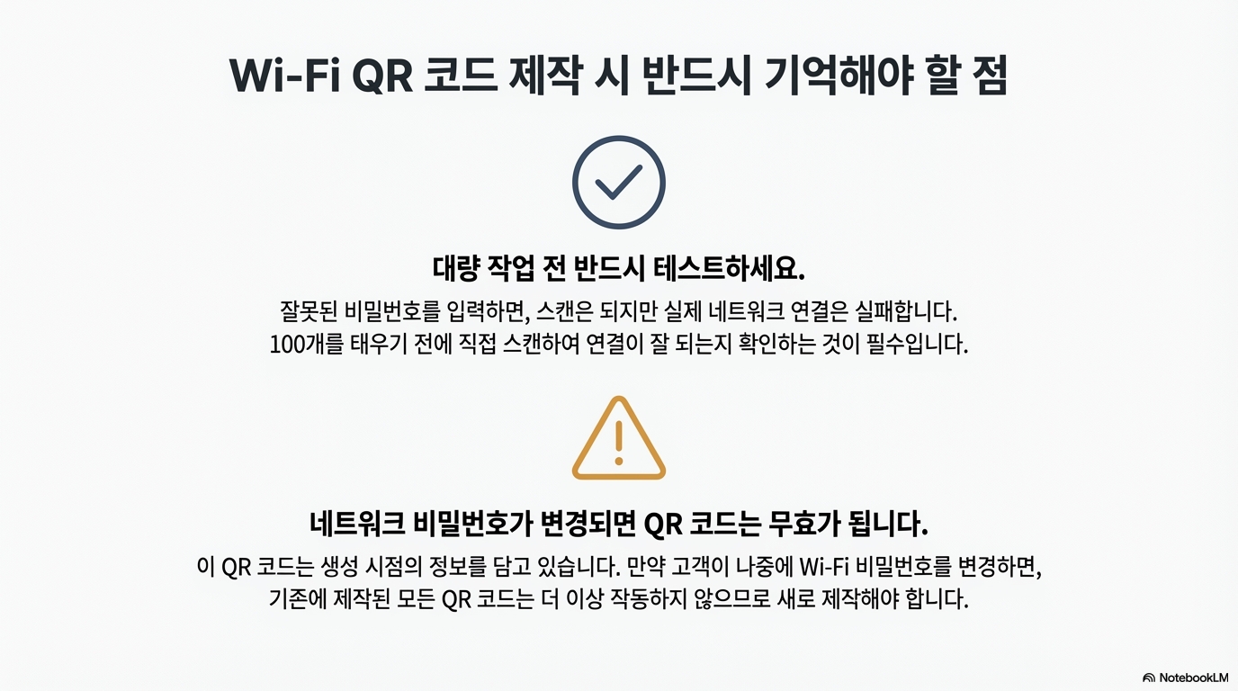 한 가지 중요한 점은, 네트워크 비밀번호가 변경되면 기존에 생성된 QR 코드는 더 이상 작동하지 않는다는 것입니다. 따라서 100개의 안내판을 만들기 전에 반드시 정확한 비밀번호로 테스트하는 과정을 거쳐야 합니다. 만약 고객이 잘못된 비밀번호를 알려줬다면 어떻게 할까요? 오히려 물리적인 제품을 수정하는 것보다 고객이 자신의 네트워크 비밀번호를 QR 코드에 맞춰 업데이트하는 것이 더 쉬운 해결책이 될 수 있습니다.