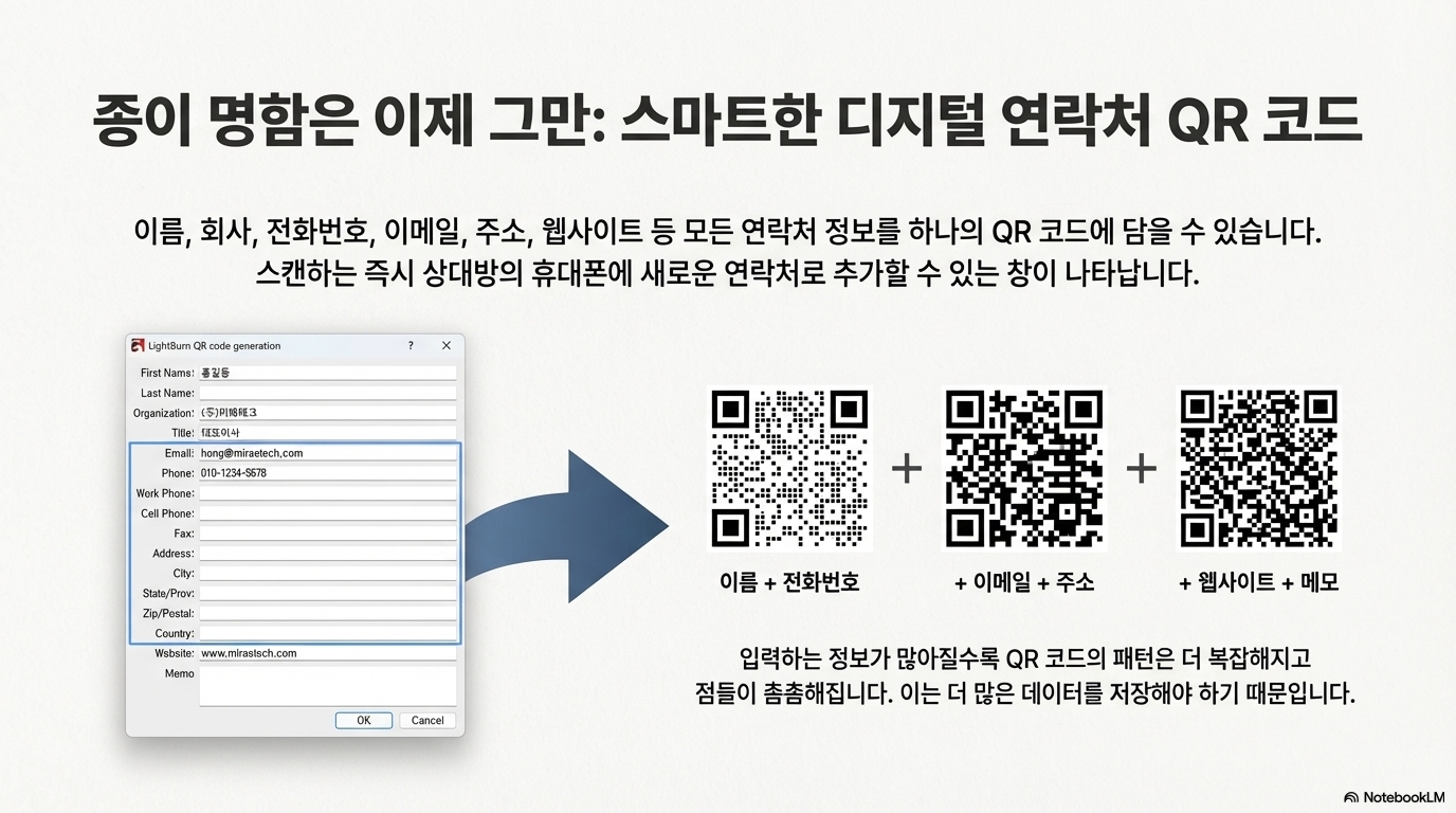 이름, 주소, 전화번호, 이메일, 웹사이트 URL 등 원하는 정보를 입력하면, 이 모든 데이터가 하나의 QR 코드에 담깁니다. 상대방이 이 코드를 스캔하면, 스마트폰에 모든 정보가 미리 채워진 '새 연락처 추가' 화면이 바로 나타납니다.