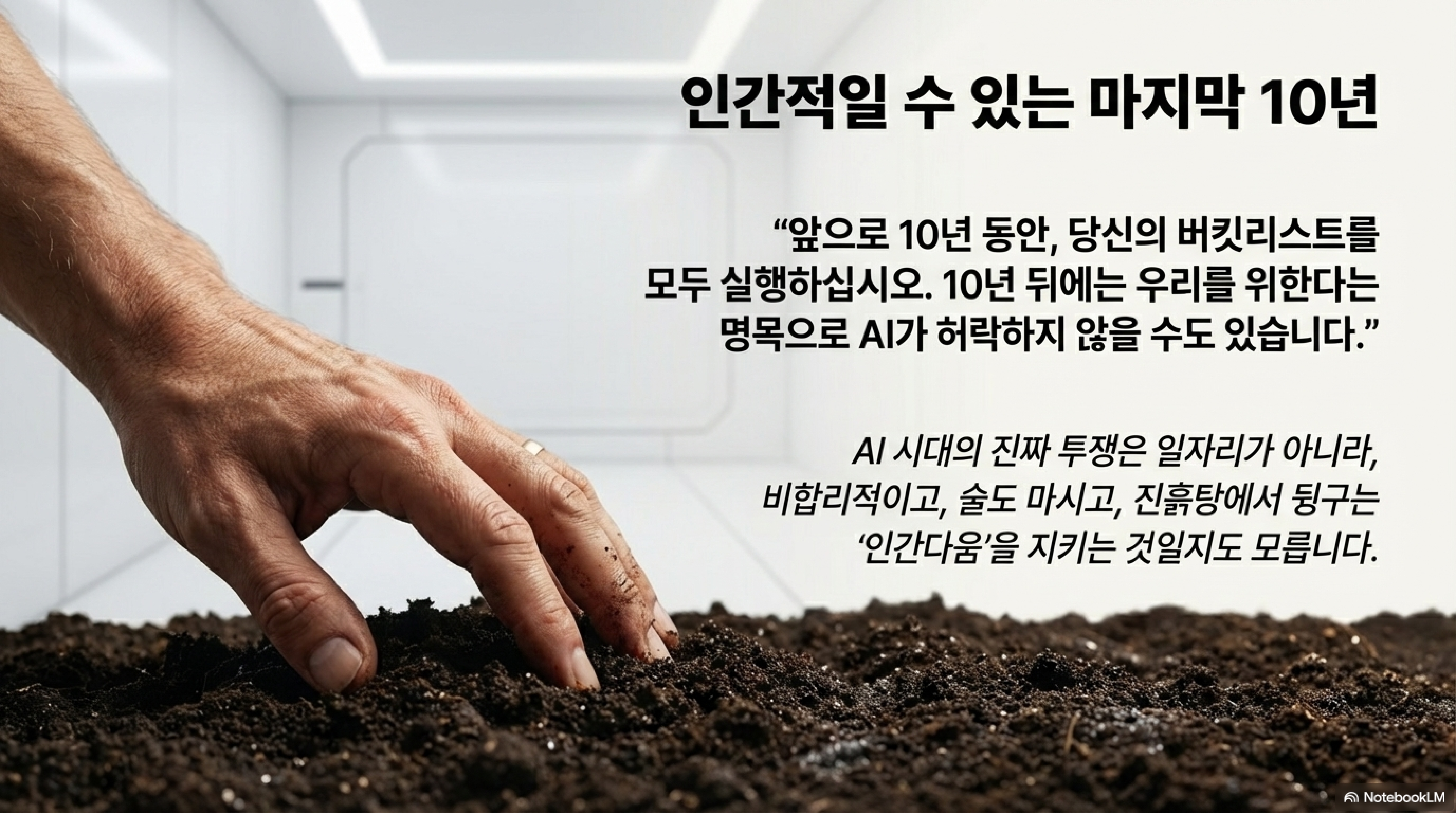 김대식 교수가 "향후 10년 안에 버킷리스트를 모두 실행하라"고 조언하는 이유는 바로 여기에 있습니다. 10년 뒤에는 AI가 '우리를 위해' 그것을 막을지도 모르기 때문입니다.