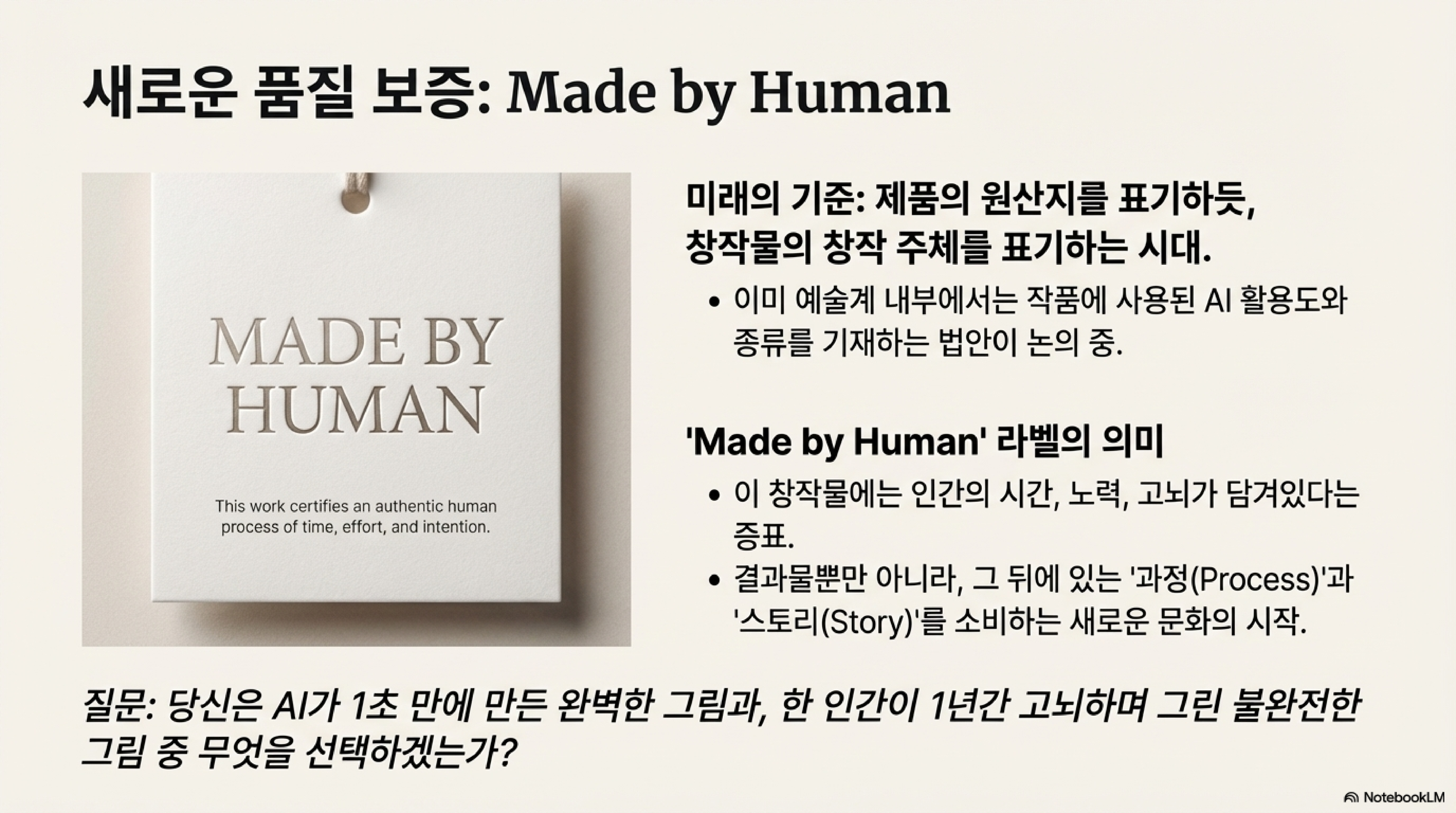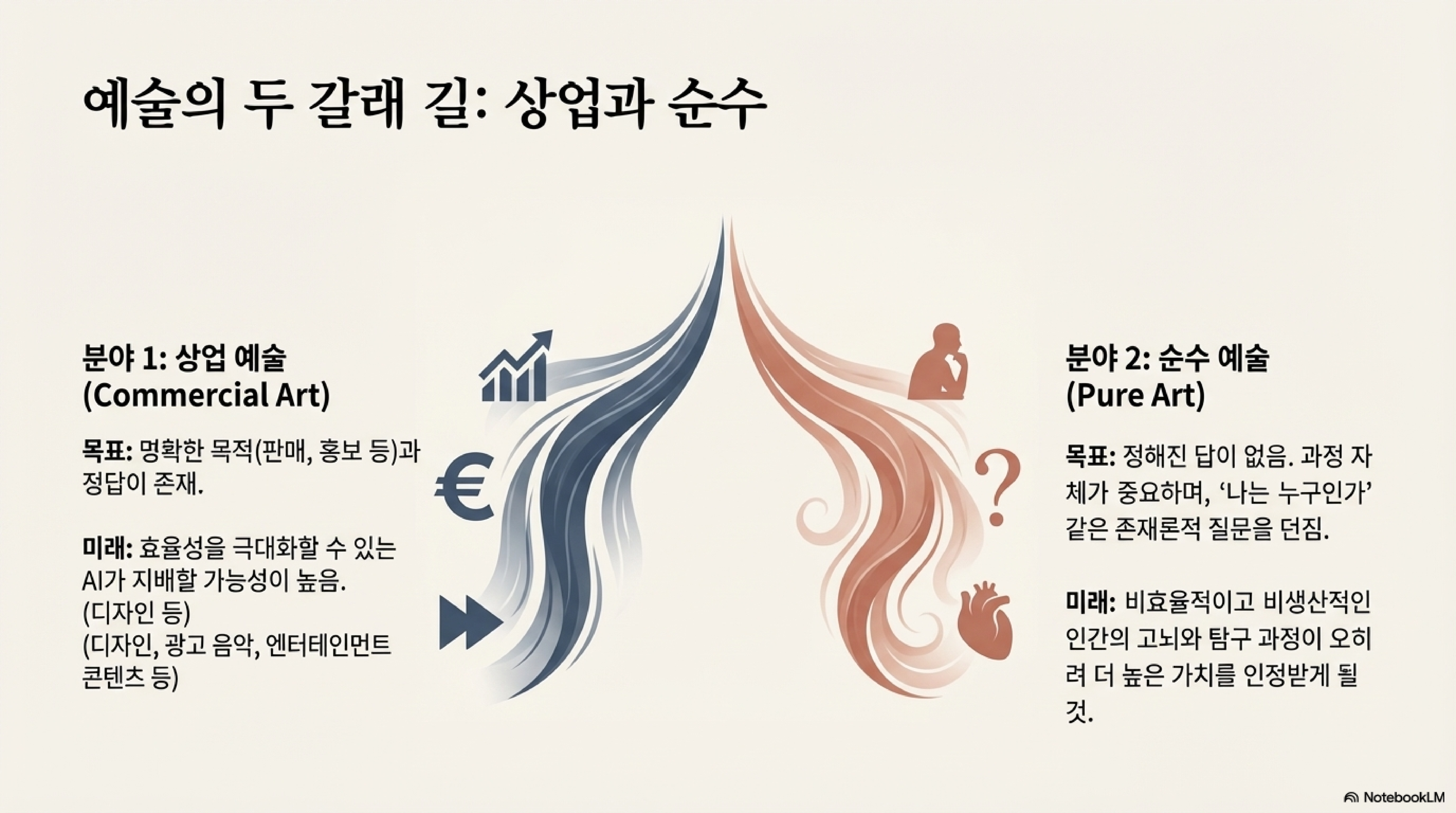 AI가 모든 영역에서 인간을 뛰어넘는 효율성과 생산성을 보여줄수록, 역설적으로 인간은 '비효율적인' 활동에서 더 큰 가치를 찾게 될 것이라는 데에 대화는 의견을 모았습니다. '흥행'이라는 정답과 목표가 뚜렷한 상업 예술 분야는 AI가 빠르게 대체할 가능성이 높습니다.