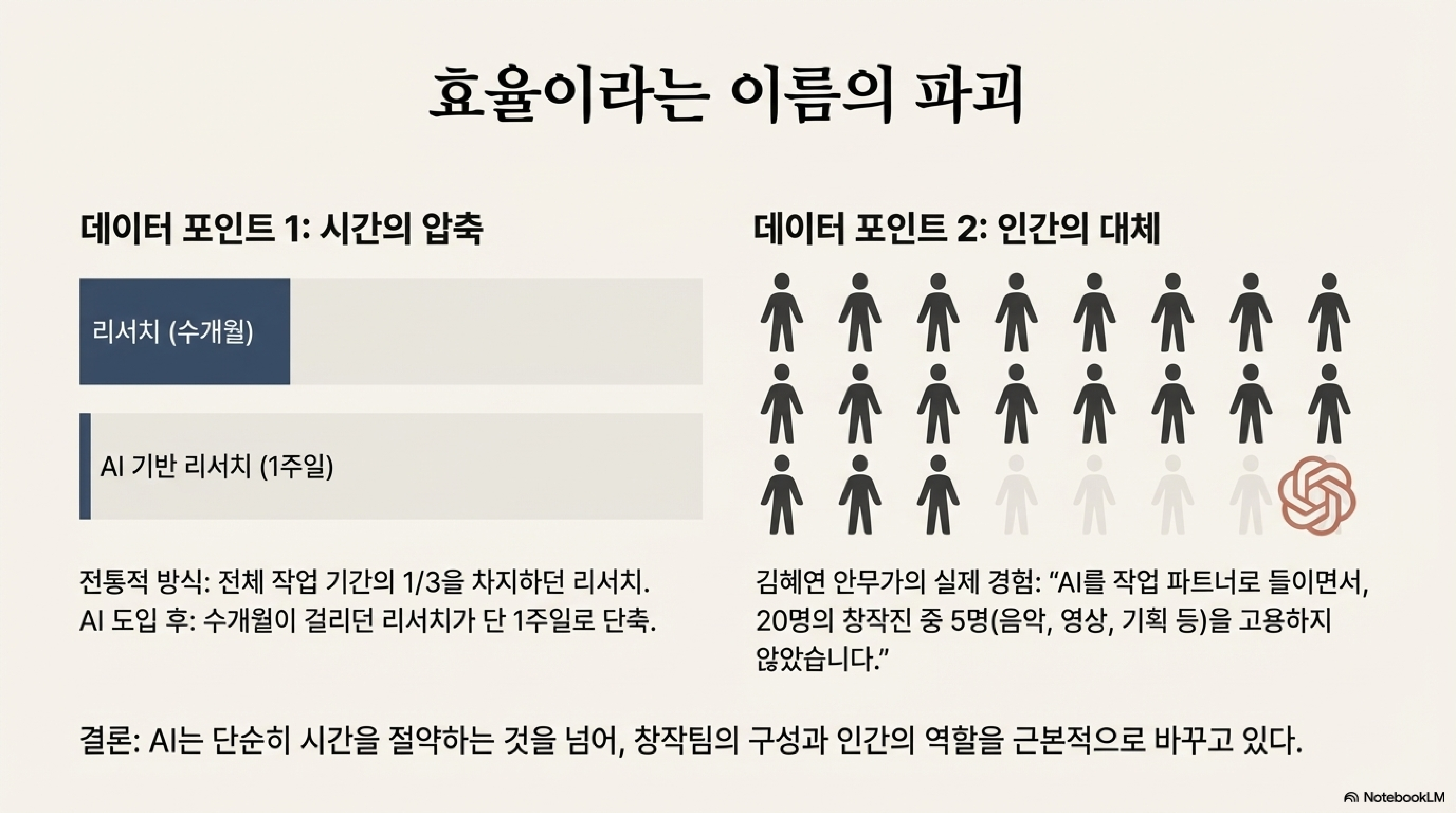 하지만 이것은 단순히 AI가 인간보다 우월하다거나 비용을 절감하는 차원의 문제가 아니었습니다. 김 안무가는 인간 동료와 일할 때와 마찬가지로 AI와 협업할 때도 뚜렷한 '장단점'이 있었다고 말합니다. 결국 '어디에 시간과 노력을 쏟을 것인가'에 대한 예술가의 선택이었던 셈입니다. 이는 창작의 과정과 예술가들의 협업 방식 자체가 근본적으로 변하고 있음을 보여주는 중요한 신호입니다.