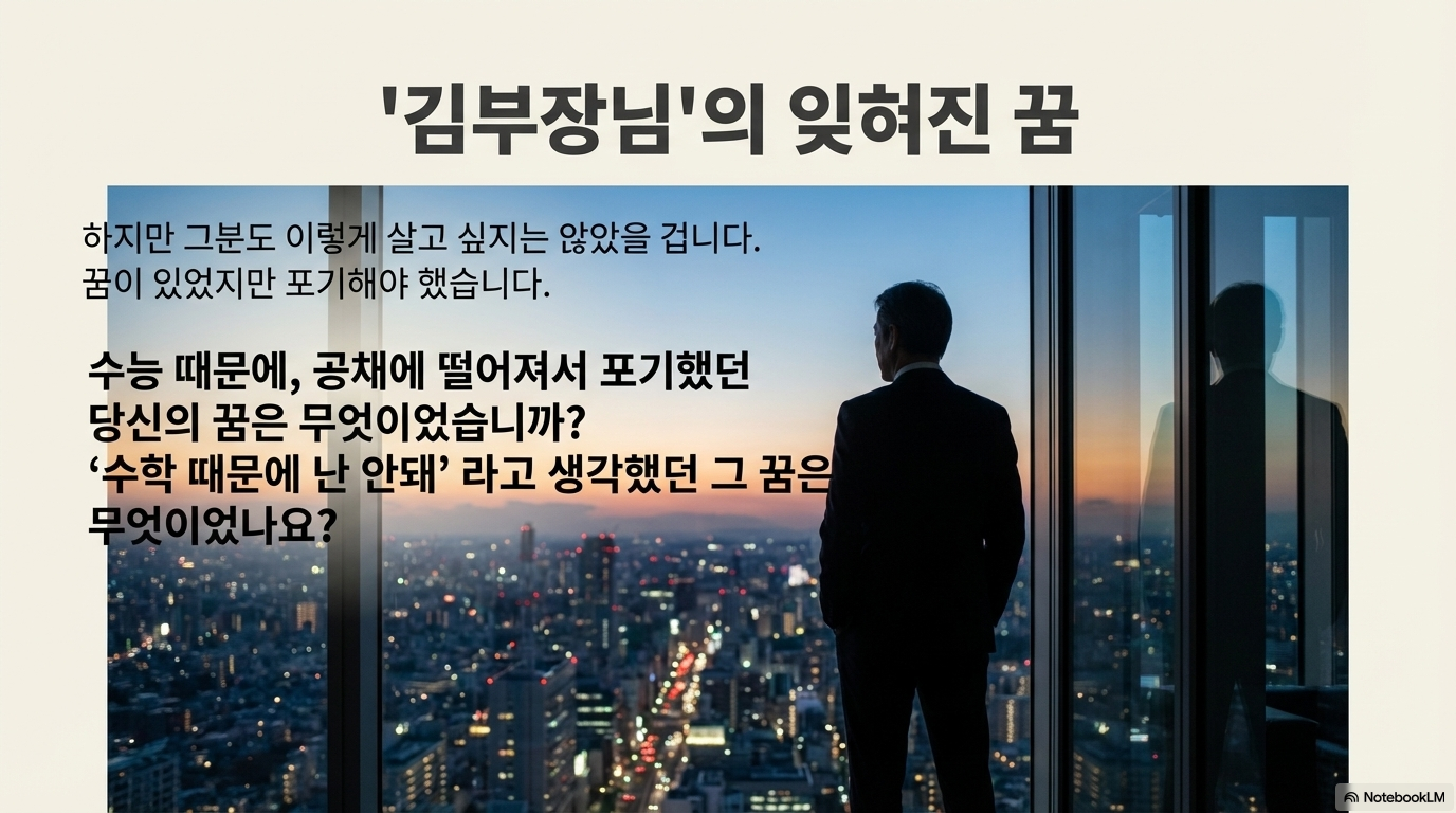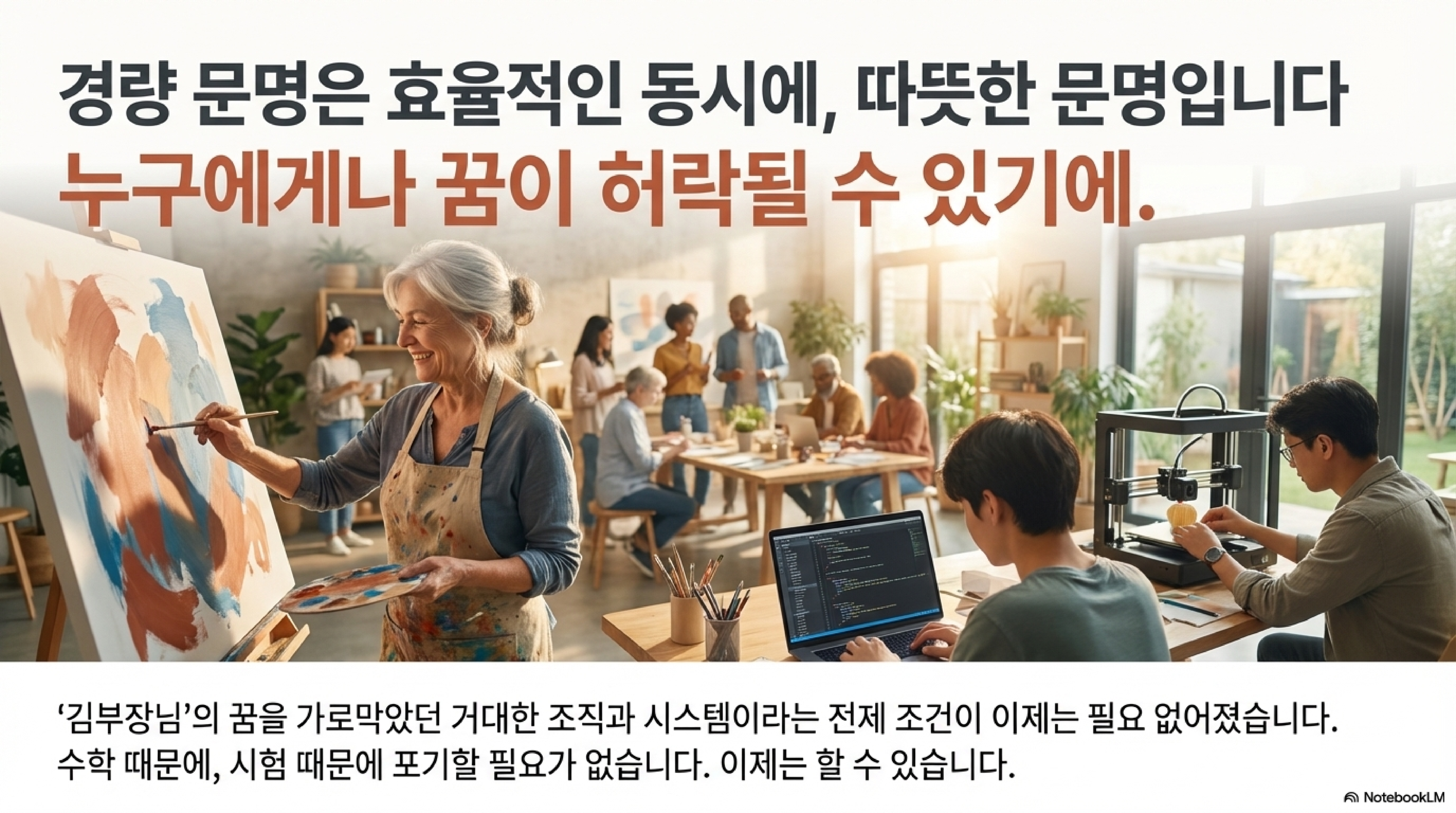 이 모든 변화는 단순히 효율만을 위한 것이 아닙니다. 과거의 시스템(수능, 공채 등)이 요구하는 조건 때문에 포기해야만 했던 '김부장님의 꿈'처럼, 우리 각자가 마음속 깊이 품고 있던 꿈을 다시 이룰 수 있게 하는 '따뜻한 문명'이기도 합니다.