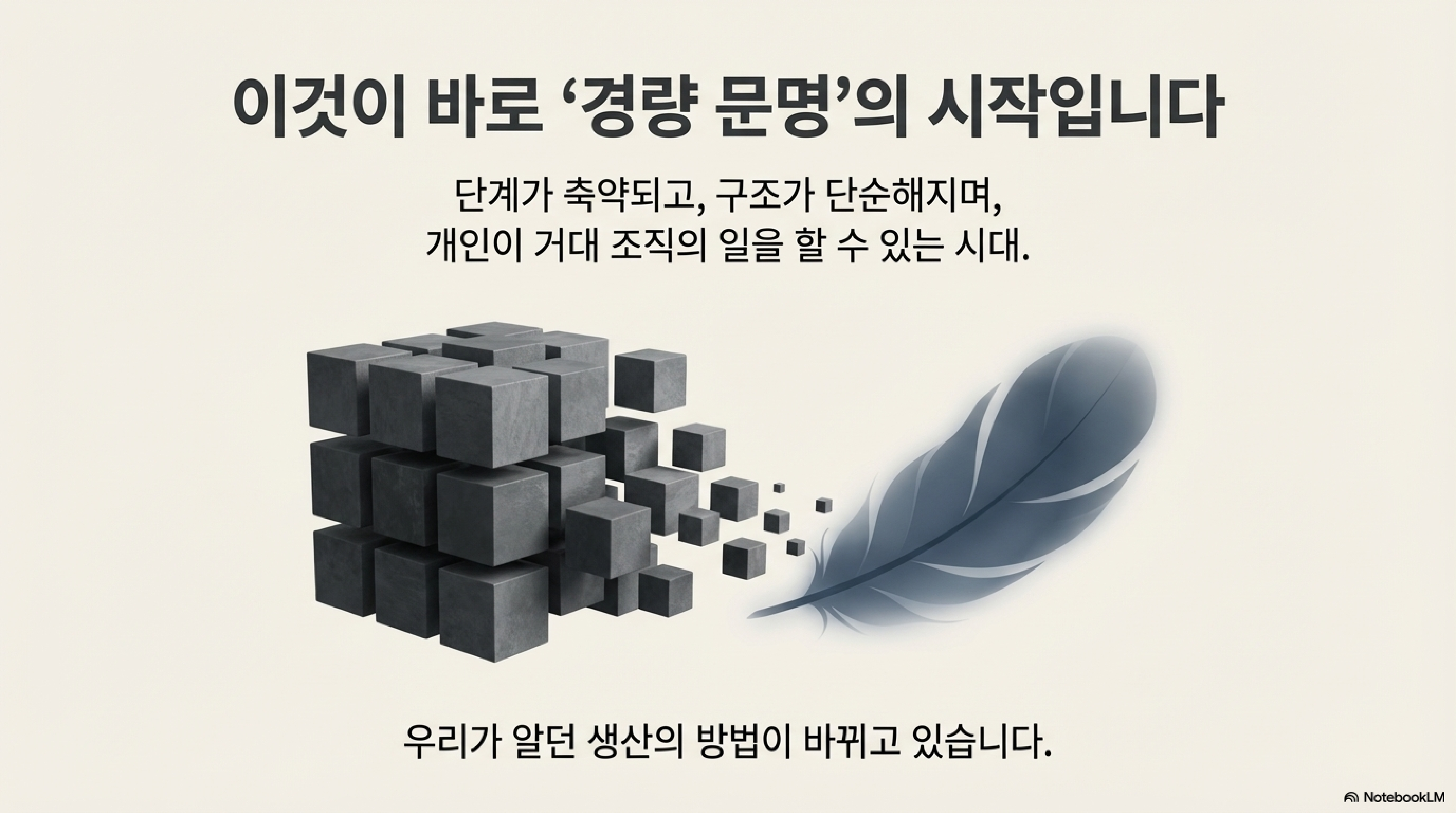 AI가 이끄는 '경량 문명'은 분명 위기입니다. 하지만 동시에 개인에게 주어진 전례 없는 기회이기도 합니다. 이제는 두려워하며 버티는 시대가 아니라, 새로운 도구를 활용해 가볍게 출발해야 할 때입니다.