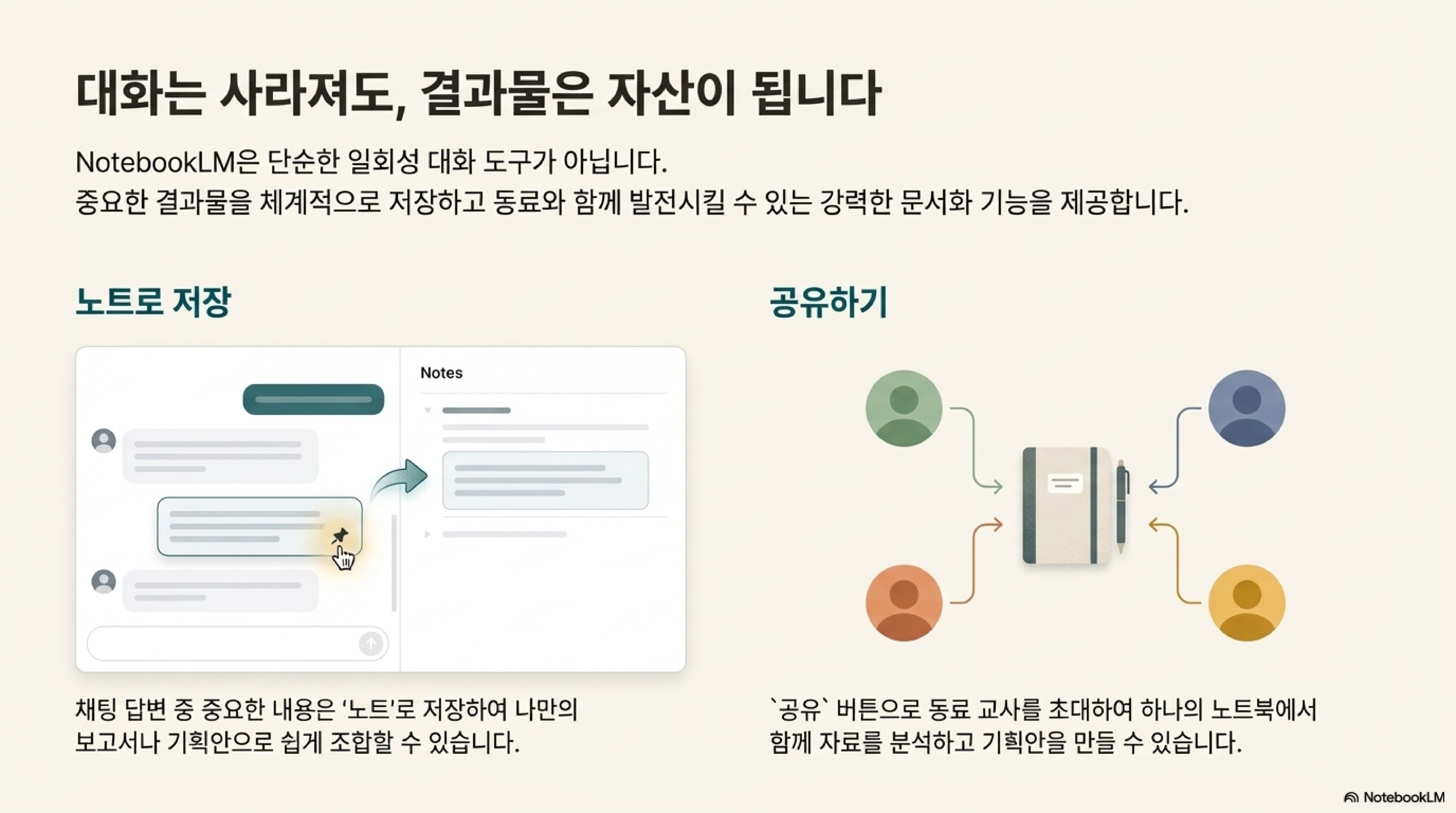 - 공유 및 협업: 생성된 노트북을 공유 버튼을 통해 동료 교사에게 초대하여 공동으로 자료를 분석하고 기획할 수 있다.