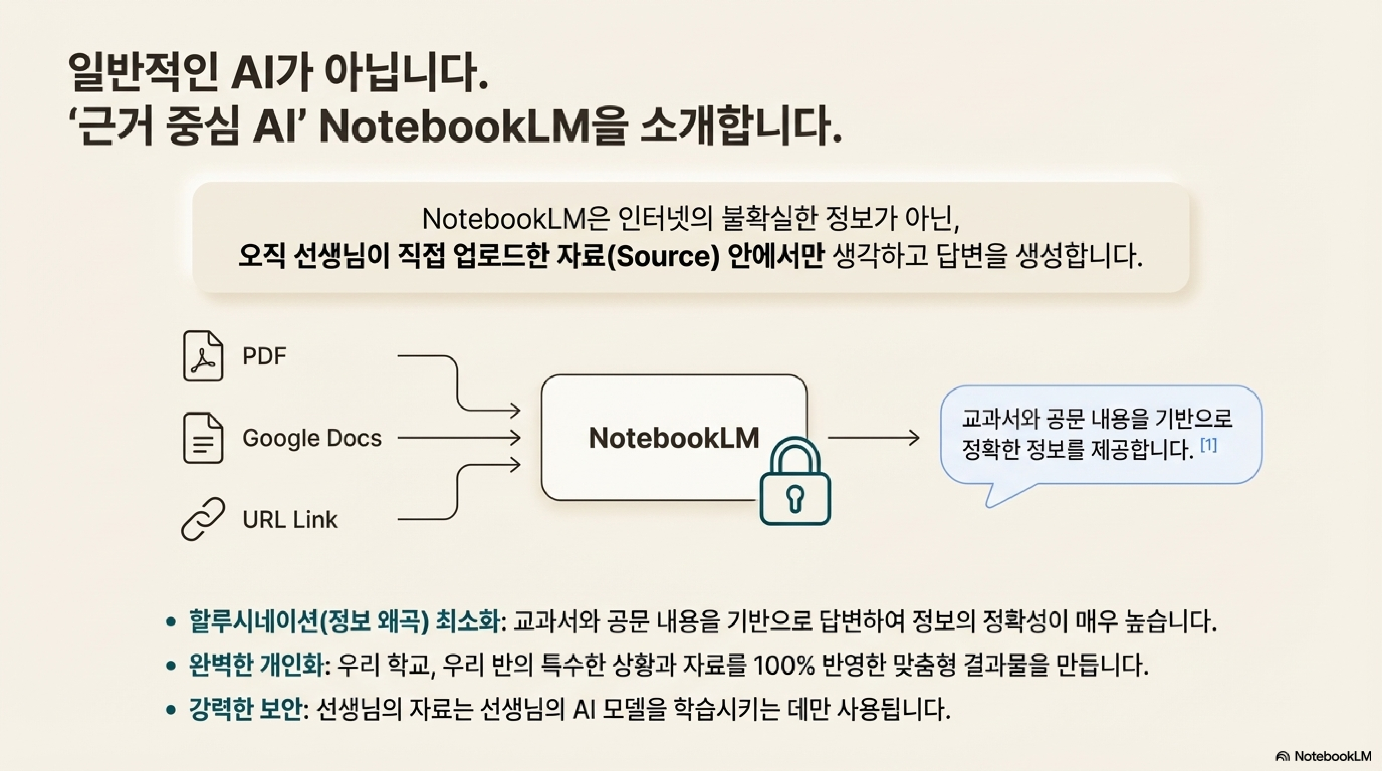 - 근거 중심 AI: 모든 답변은 업로드된 교과서, 공문, 보고서 등을 기반으로 하므로 정보 왜곡(할루시네이션) 현상을 최소화할 수 있다. 이는 정보의 정확성이 중요한 교육 현장에 매우 적합한 특성이다.