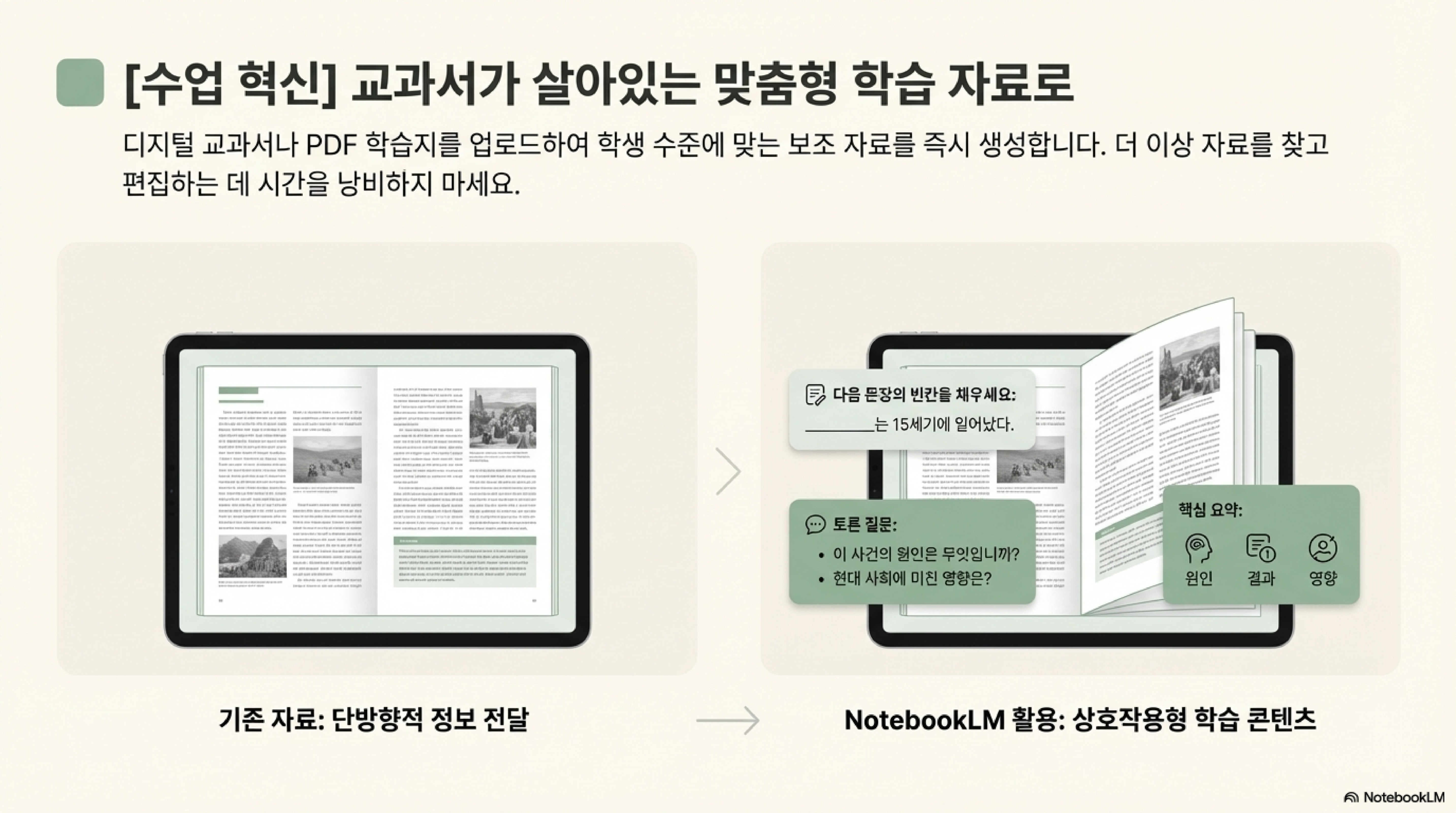 - 핵심 도입 목표: NotebookLM은 교육 현장의 두 가지 주요 과제인 교사의 행정 업무 경감과 학생을 위한 개별화 교육을 동시에 지원하는 것을 목표로 한다. 이를 통해 교사는 반복적인 문서 작업에서 벗어나 교수학습 활동에 더 집중할 수 있다.