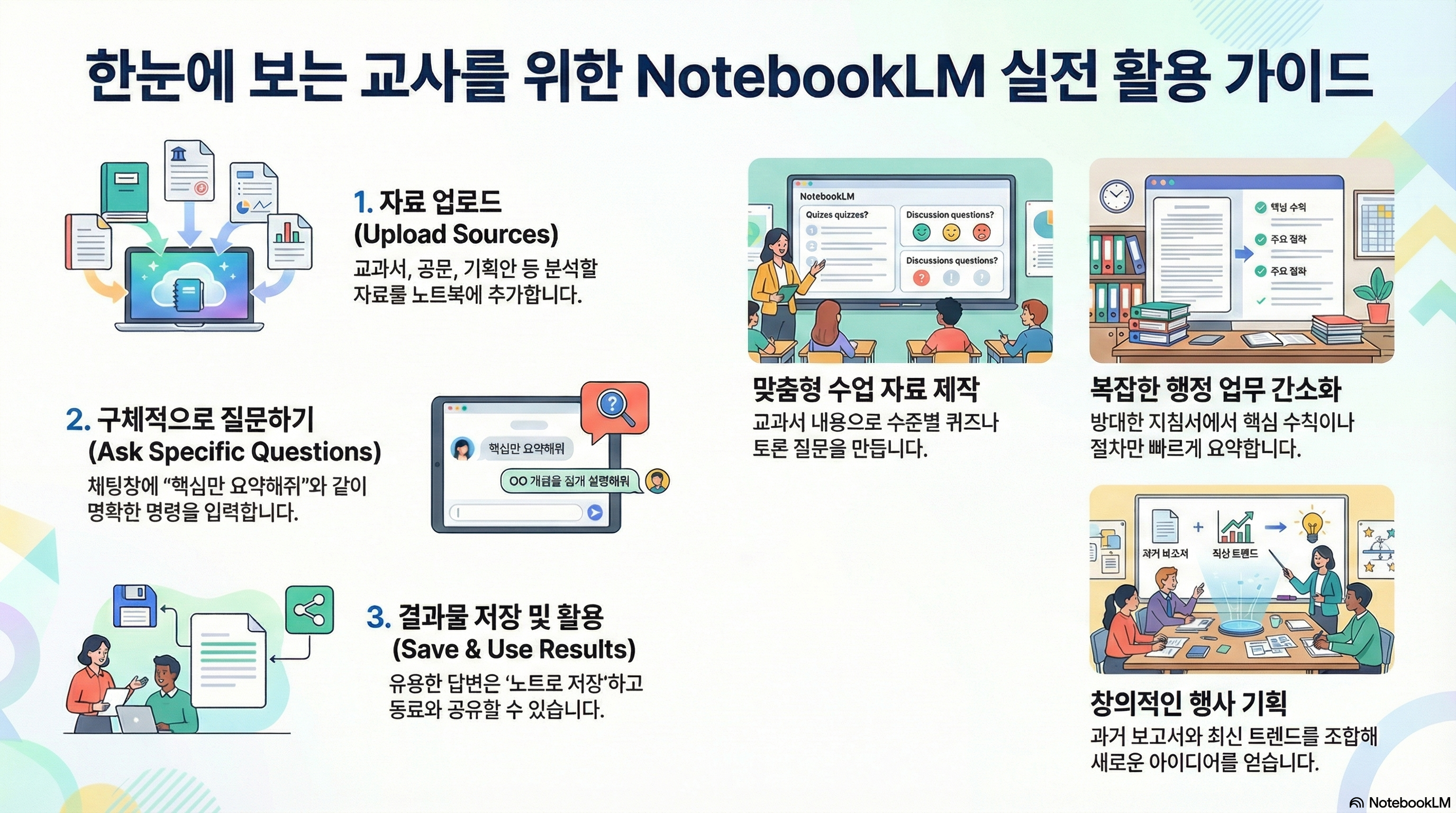 NotebookLM의 활용성은 크게 교수학습, 행정 업무, 행사 기획이라는 세 가지 영역에서 극대화될 수 있다.
