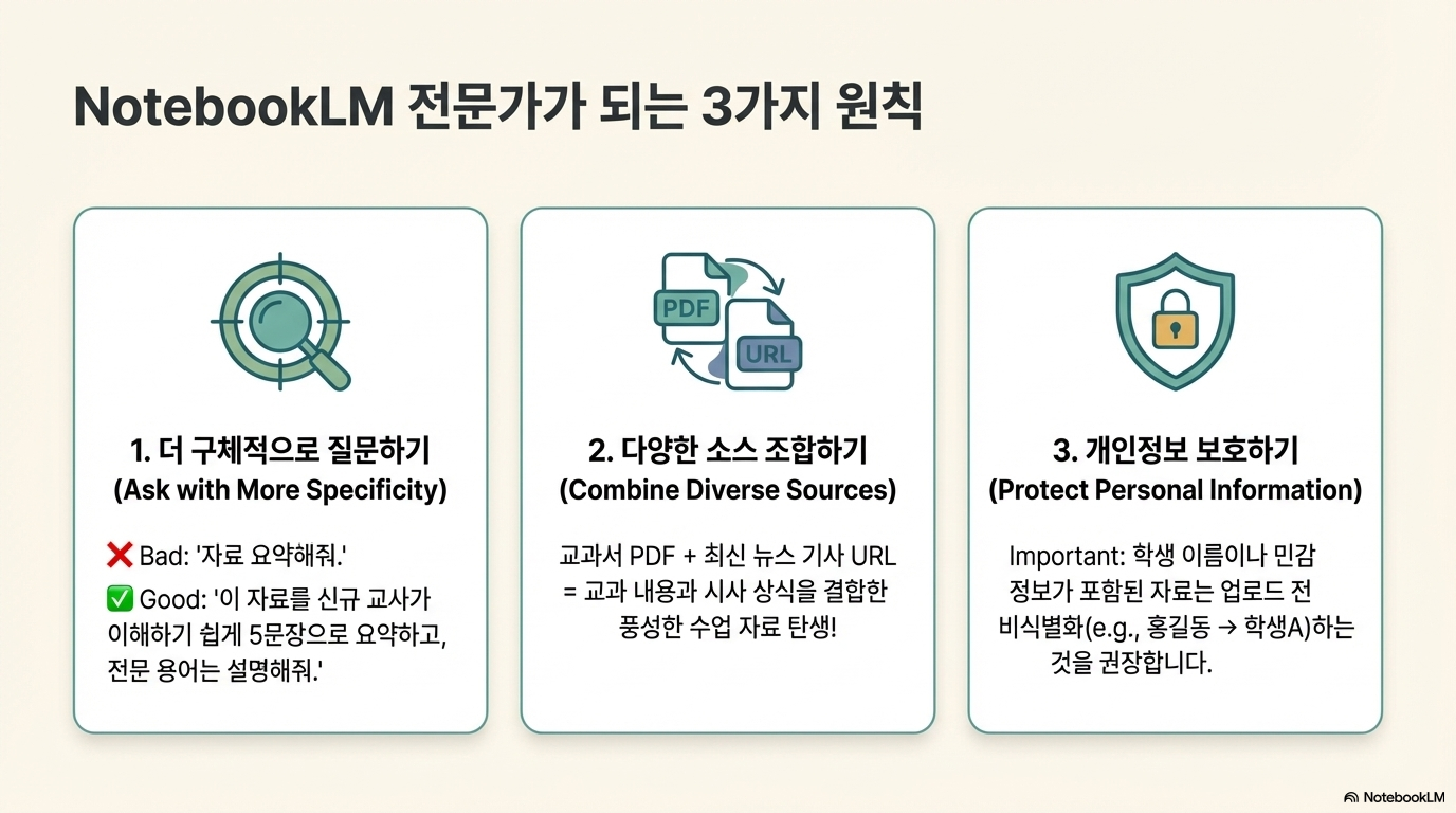 - 구체적인 질문: "자료 요약해줘"와 같은 모호한 요청보다 "이 자료를 신규 교사가 이해하기 쉽게 5문장으로 요약해줘"처럼 역할, 대상, 형식을 구체적으로 지정할 때 훨씬 정확한 결과물을 얻을 수 있다.
