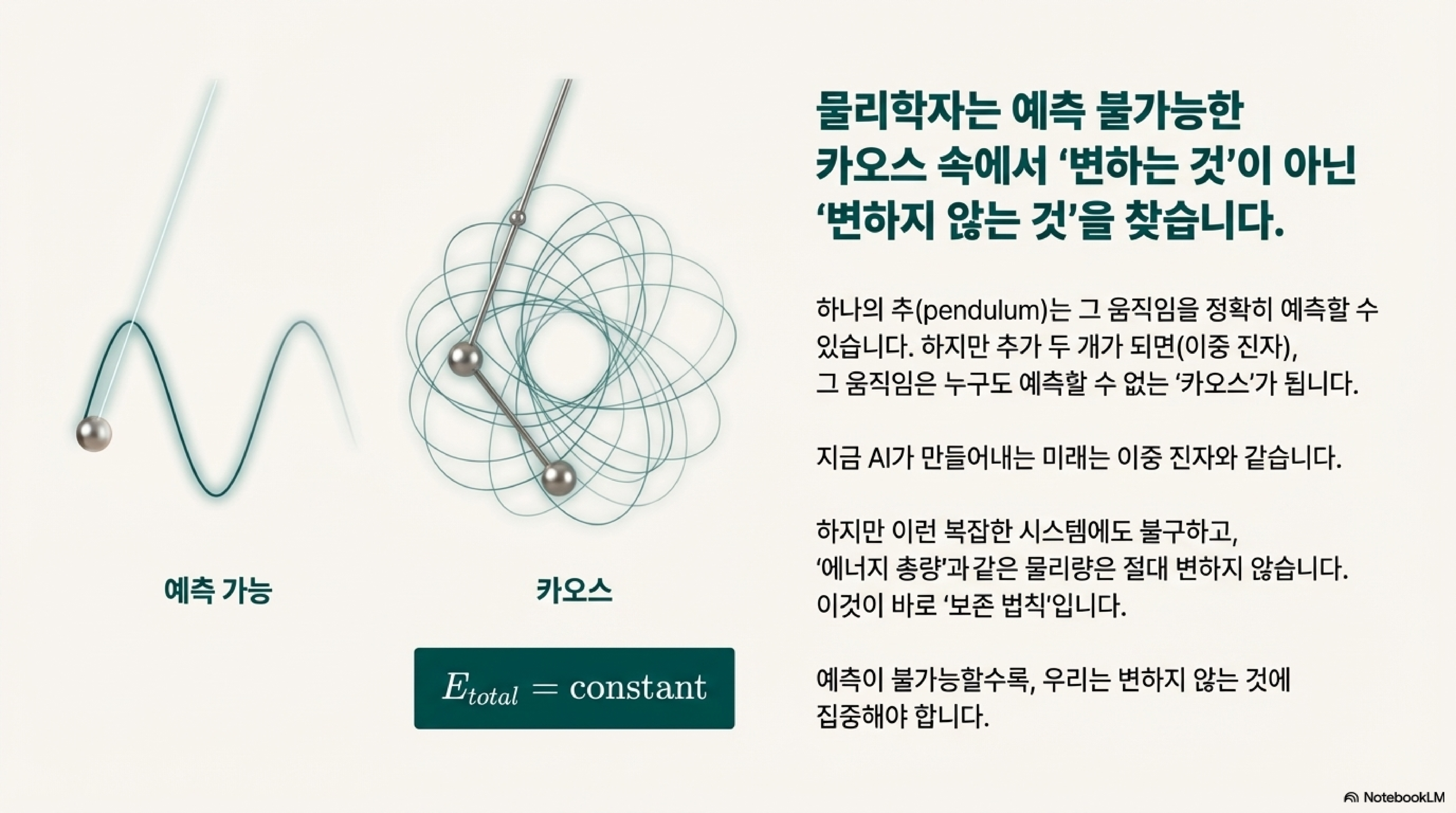 물리학자들은 이중 진자(double pendulum)처럼 복잡하고 예측 불가능한 카오스 시스템을 마주했을 때, 그 움직임 하나하나를 예측하려 하지 않습니다. 대신 그 혼돈 속에서도 절대 변하지 않는 '보존량', 즉 에너지 보존 법칙과 같은 불변의 원리를 찾아냅니다. 변화가 극심할수록 변하지 않는 것을 먼저 파악하는 것이 문제 해결의 핵심이라는 것입니다.
