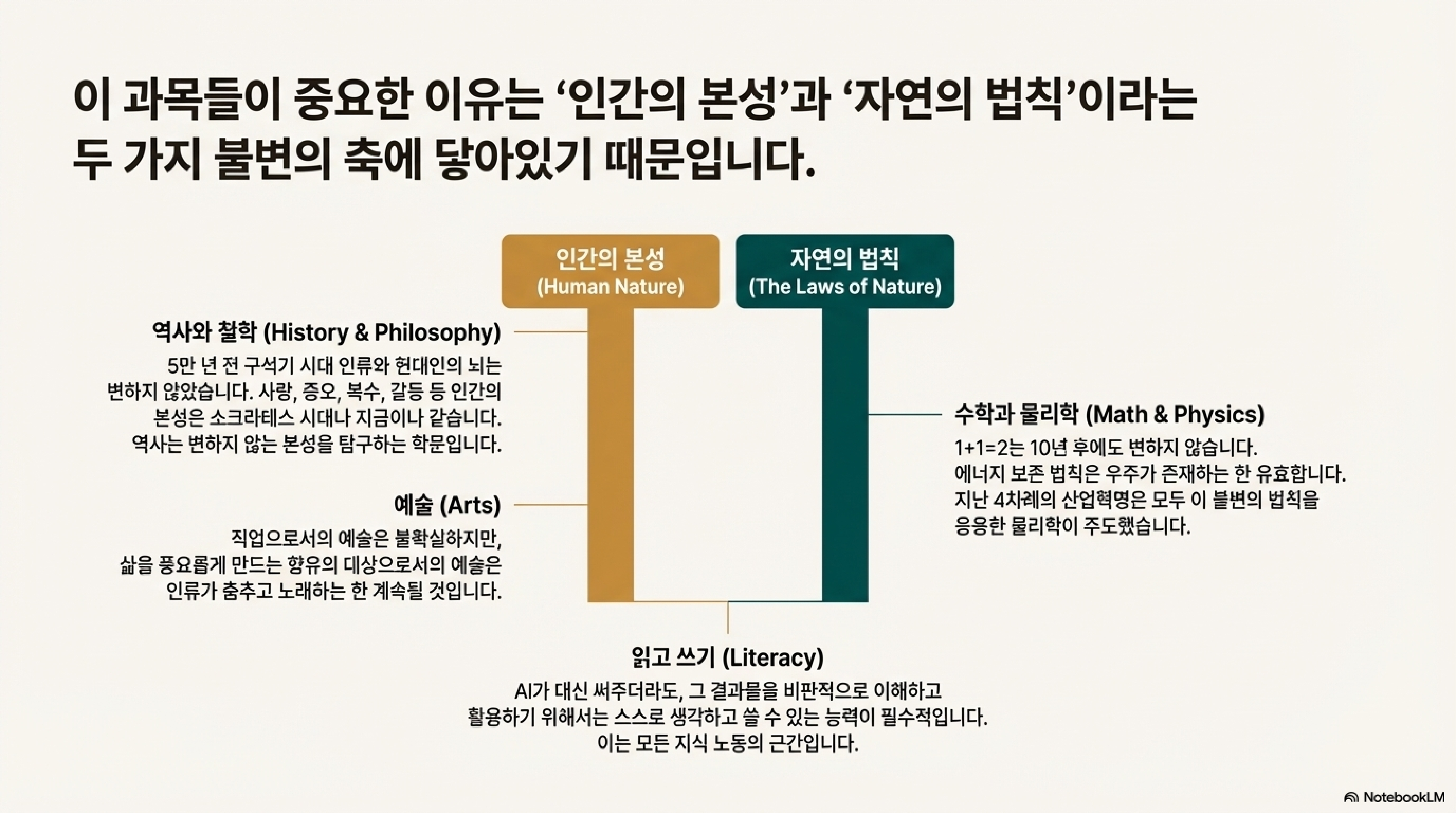 - 역사와 철학 (History and Philosophy): 인간의 본성은 5만 년 전이나 지금이나 변하지 않았기 때문입니다. 김 교수의 말처럼 “사람들이 화내고 싸우고 사랑하고 복수하고 미워하는 것은 지금이나 셰익스피어의 시대나 소크라테스의 시대나 똑같습니다.” 역사는 이 변하지 않는 인간 본성이 특정 상황에서 어떻게 발현되는지를 보여주는 최고의 교과서입니다.