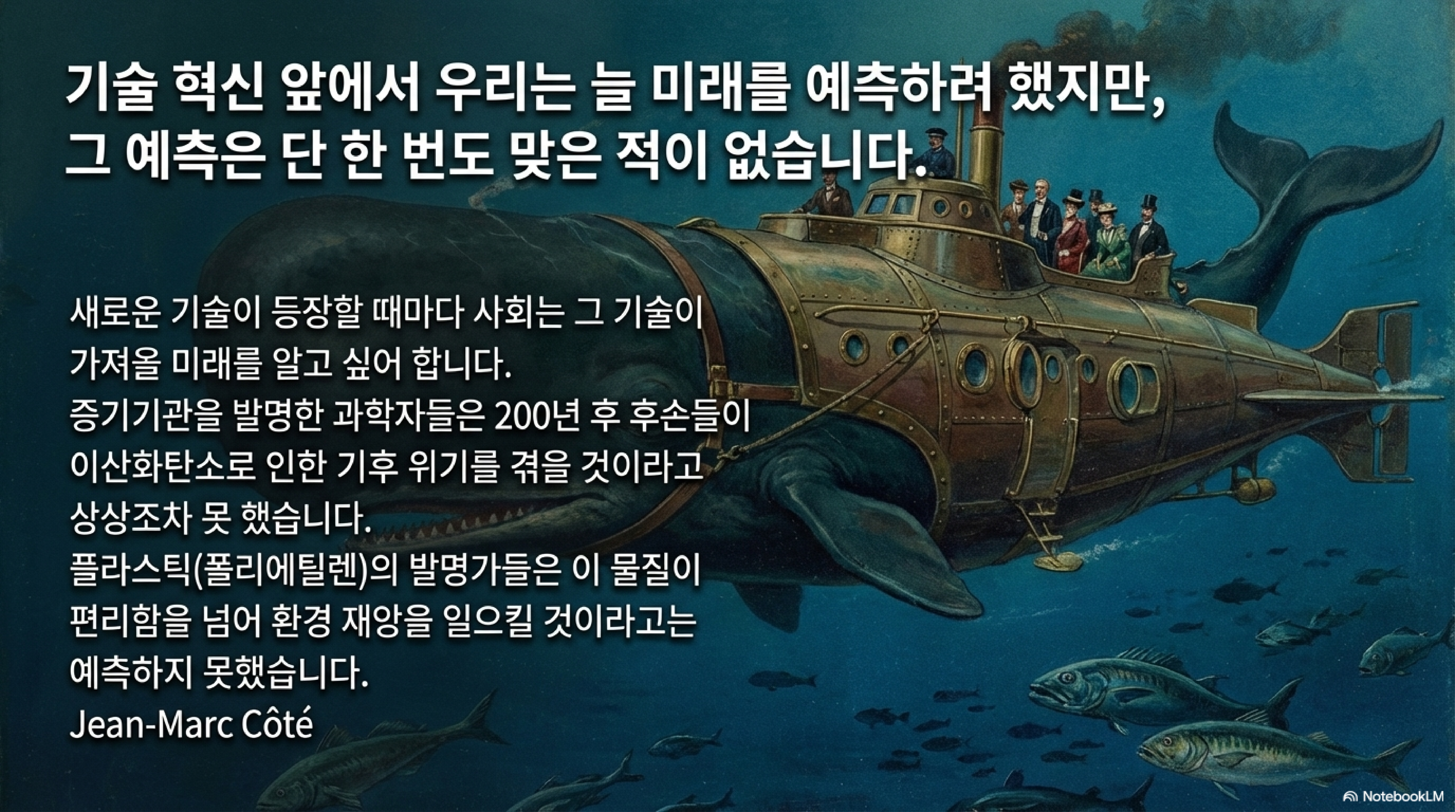- 1900년대의 미래 상상도: 1900년대 사람들이 상상한 '2000년의 세상' 그림에는 고래가 끄는 잠수함이 등장합니다. 이것은 단순한 상상력의 실패가 아닙니다. 당시 내연기관은 고장이 잦았고, 도로, 신호등, 교통법규, 보험 등 인프라가 전무했습니다. 그런 시대에 물속에서 고장 날 것이 뻔한 기계 동력원보다 생물 동력원이 더 합리적인 예측이었던 셈입니다. 이는 당대의 지식으로 미래를 그리는 것이 얼마나 논리적 오류에 빠지기 쉬운지 보여줍니다.