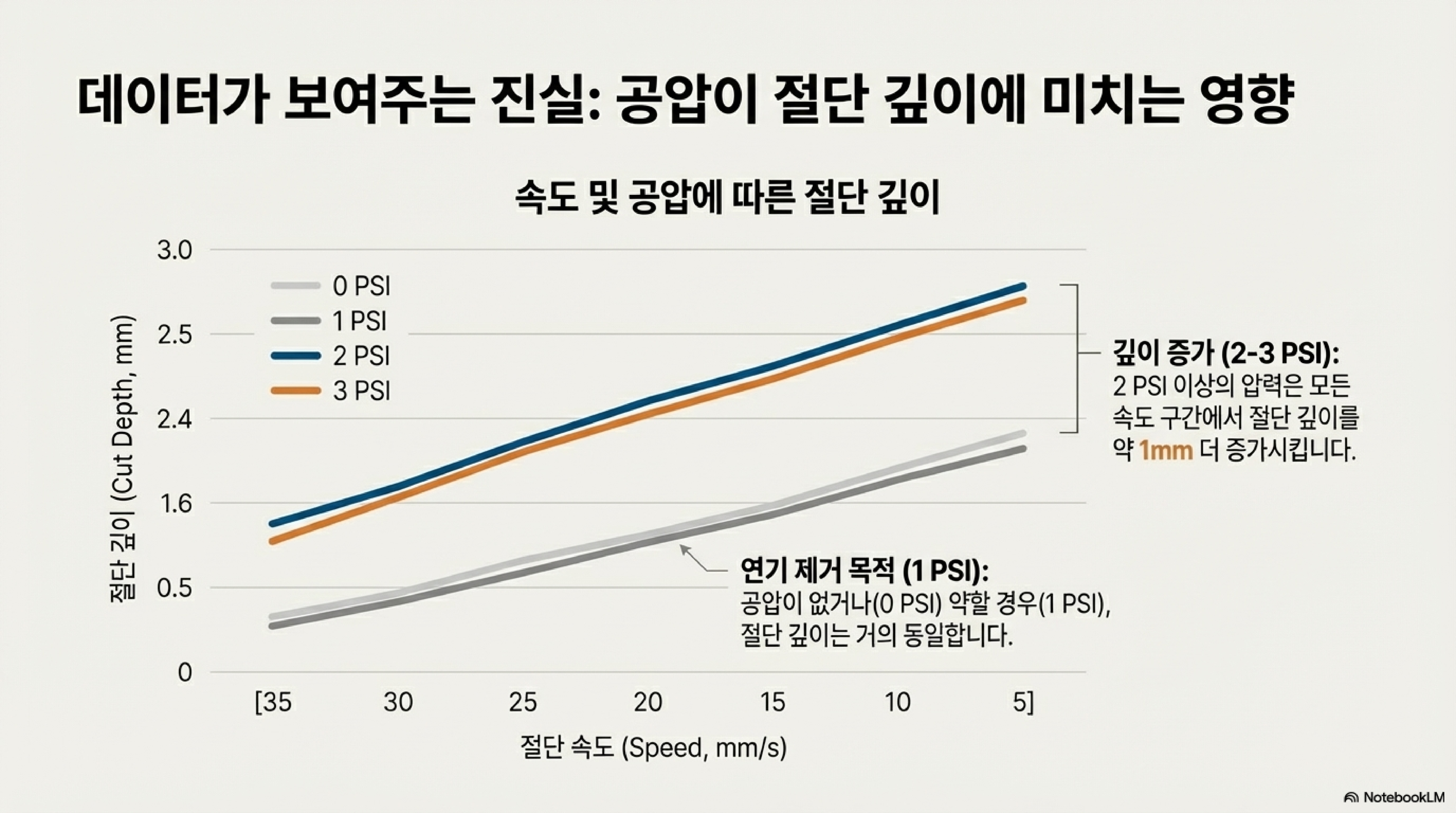 저는 공기 압력(에어 어시스트 없음, 1 PSI, 2 PSI, 3 PSI)을 다르게 설정하고 여러 속도로 절단 깊이를 테스트했습니다. 결과는 예상 밖이었습니다. 낮은 압력(1 PSI)은 공기가 없을 때와 비슷한 절단 깊이를 보였지만, 더 높은 압력인 2 PSI와 3 PSI에서는 오히려 절단 깊이가 약 1mm 감소했습니다.