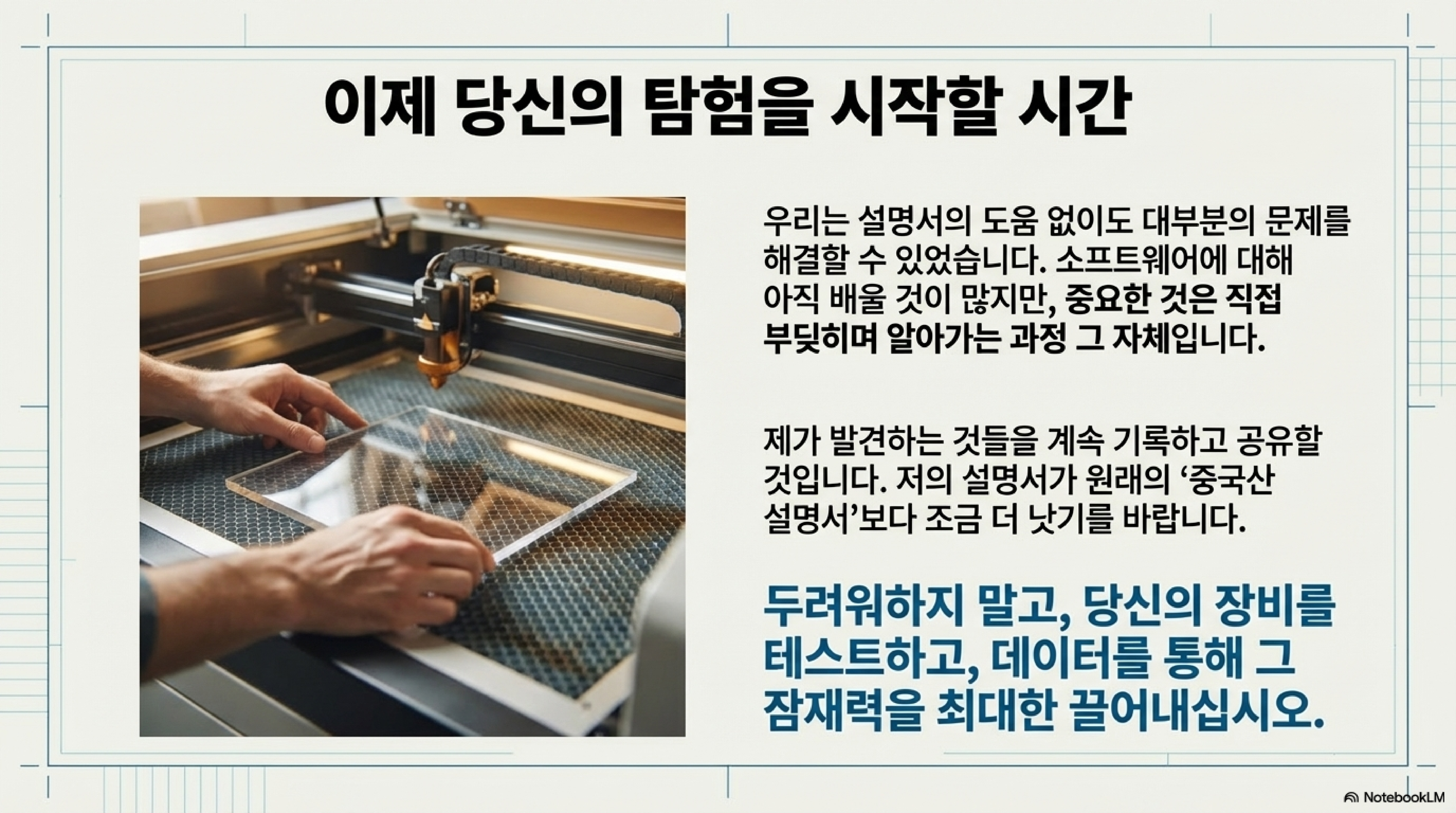 이번 실험을 통해 얻은 가장 큰 교훈은, 가장 가치 있는 지식은 단순히 설명서를 읽는 것이 아니라 직접 손으로 부딪히며 실험하는 과정에서 나온다는 것입니다. 기계의 특성을 이해하고 잠재력을 최대한 끌어내는 열쇠는 바로 여러분의 호기심과 테스트에 있습니다.