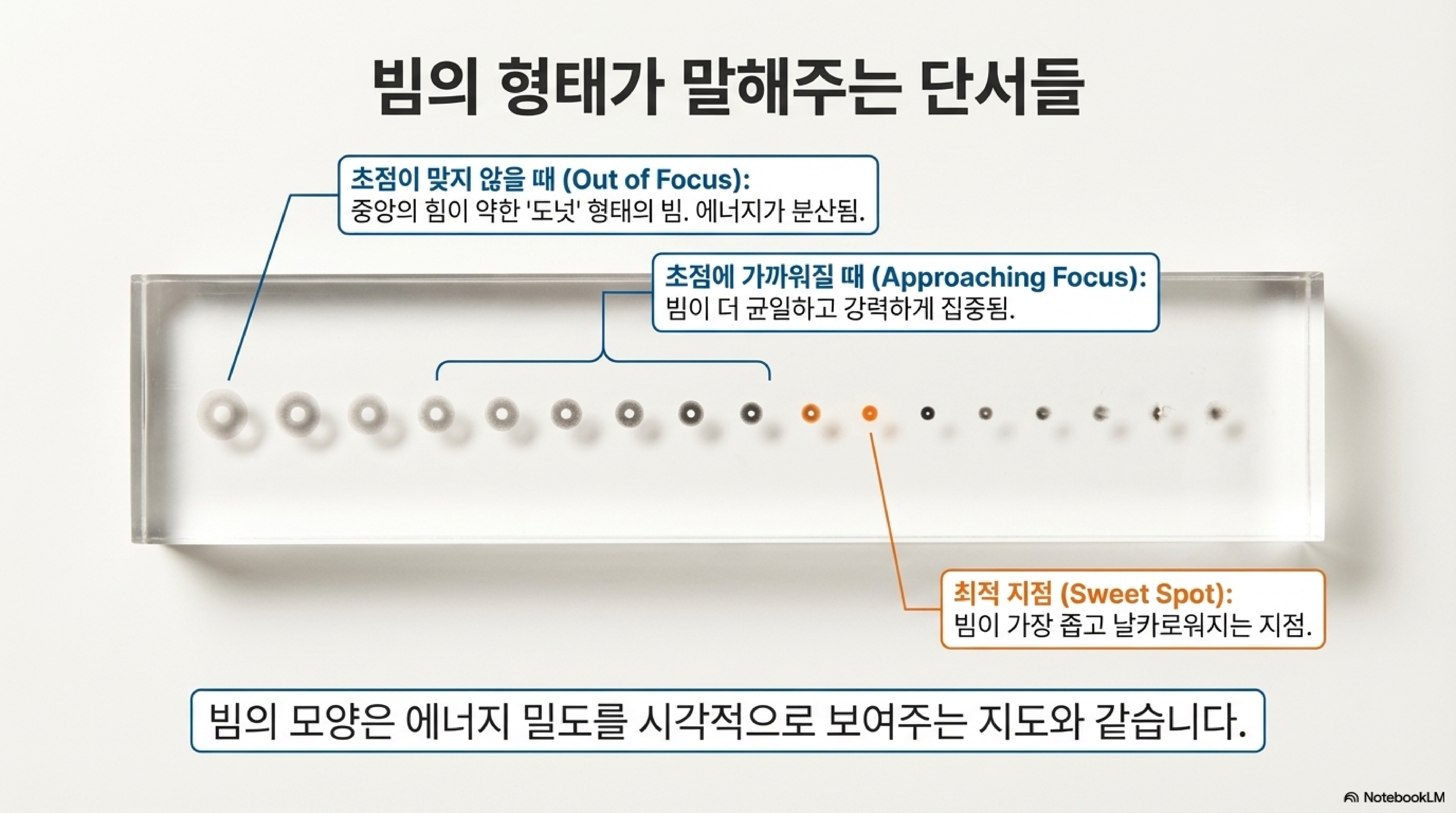 이것은 매우 직관에 반하는 발견입니다. 우리는 흔히 레이저 빔을 강력한 하나의 점이라고 생각하지만, 실제 물리적인 형태와 에너지 분포는 초점 거리에 따라 극적으로 변합니다. 이는 직접 관찰하지 않고서는 결코 알 수 없는 세부 사항입니다.