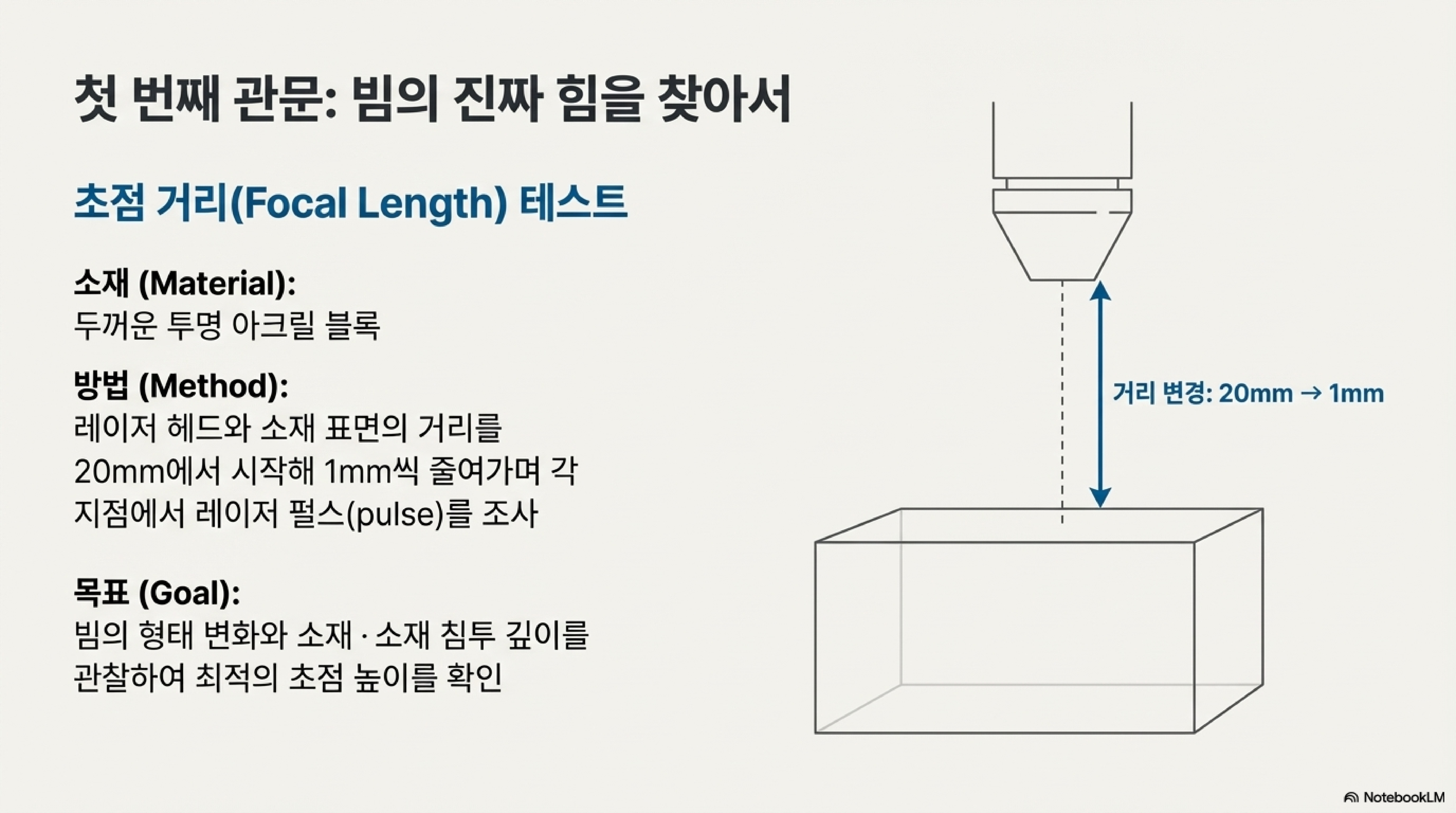 저는 아크릴 블록과의 거리를 20mm에서 시작해 1mm까지 줄여가며 각 지점에서 레이저를 발사하는 실험을 진행했습니다. 그 결과, 가장 효과적이고 강력한 절단 성능을 발휘하는 초점 범위가 표면으로부터 5mm에서 7mm 사이라는 매우 좁은 구간에 있다는 사실을 발견했습니다.