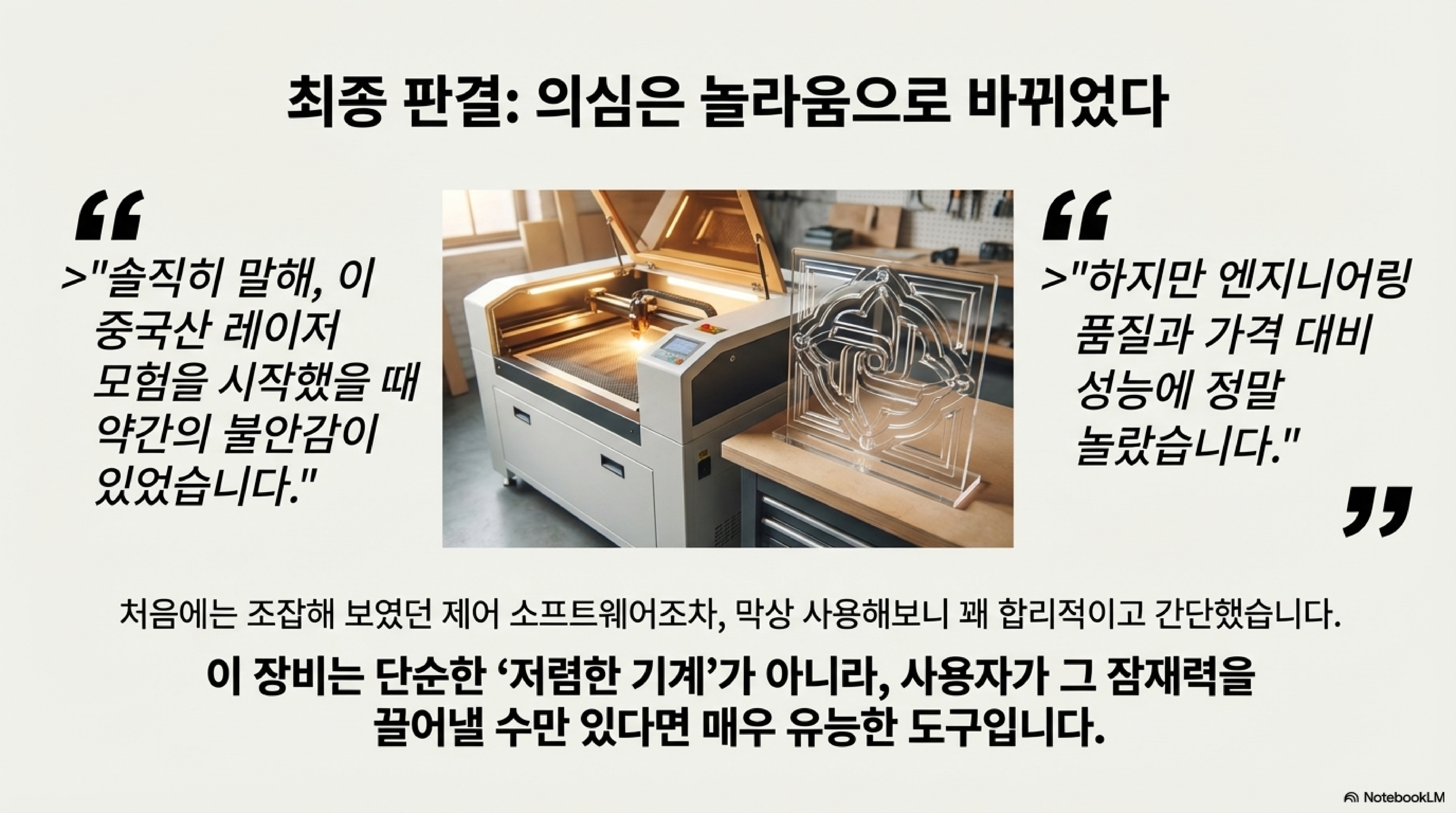 하지만 결과적으로 이 장비의 엔지니어링 품질과 가성비는 제 예상을 훨씬 뛰어넘어, 말 그대로 '놀라움' 그 자체였습니다. 심지어 처음에는 "조잡한 장난감 같은 소프트웨어"라고 생각했던 프로그램조차도 실제 사용해보니 "꽤 합리적이고 사용하기에 상당히 간단하다"는 것을 알게 되었습니다.
