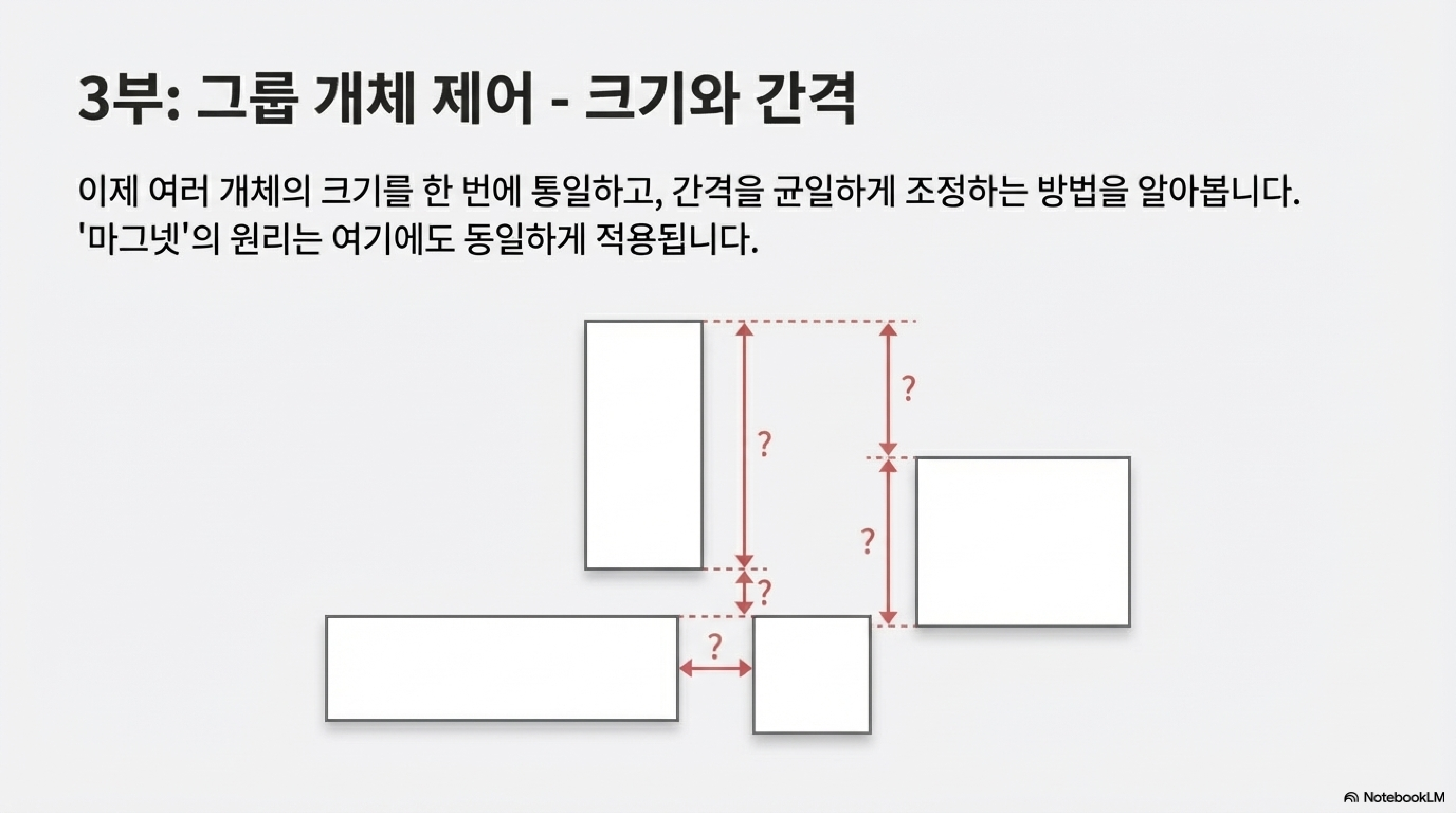 여러 객체를 선택하고 정렬 버튼을 눌렀을 때, 어떤 객체는 가만히 있고 다른 객체들만 움직이는 것을 본 적이 있을 겁니다. 여기에는 '자석(magnet)' 객체라는 핵심 원리가 숨어있습니다. 여러 객체를 정렬할 때, 기준이 되어 움직이지 않는 하나의 '자석' 객체가 존재하고 나머지 객체들이 그 기준에 맞춰 끌려오듯 움직입니다.