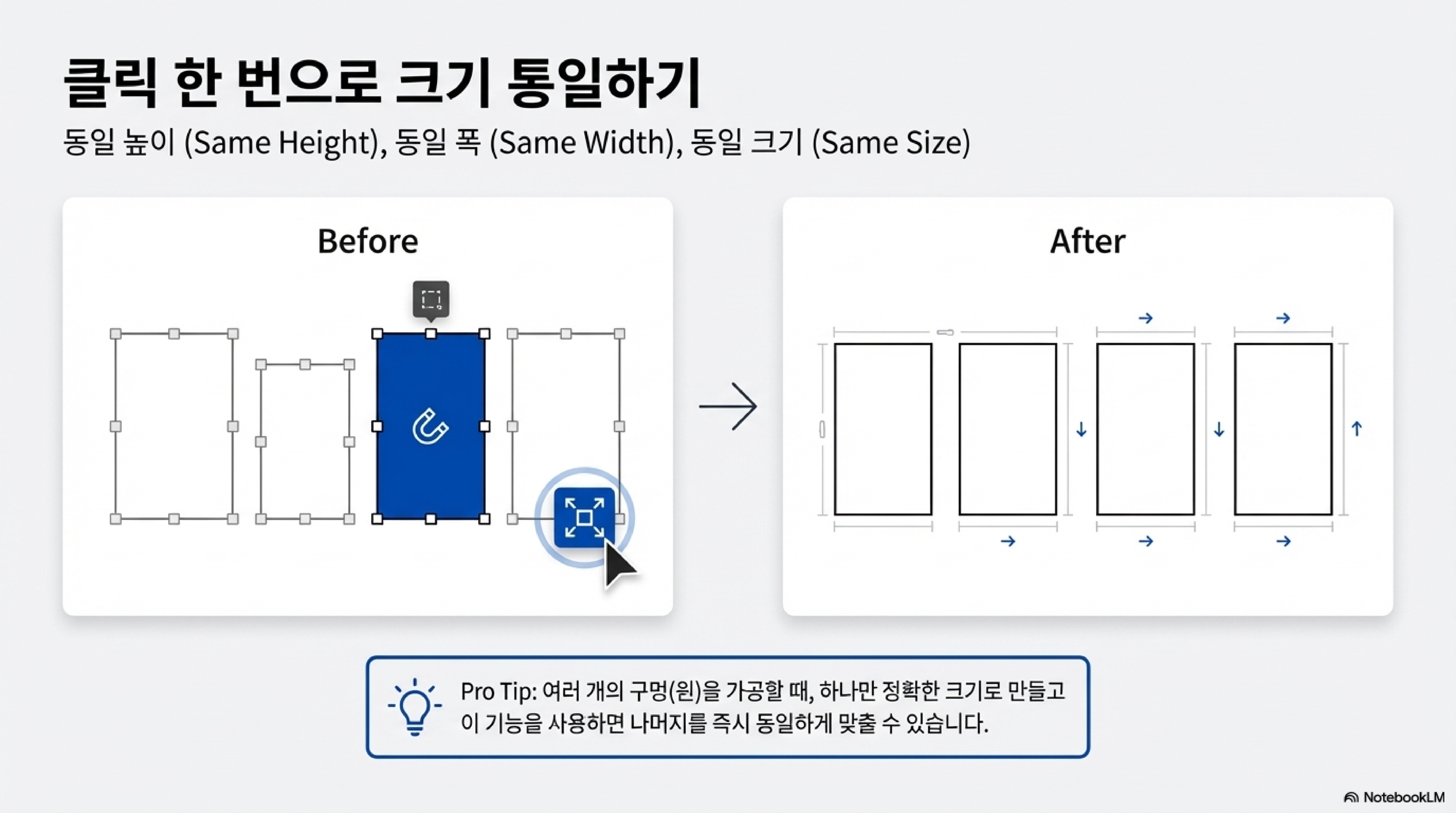 크기가 제각각인 여러 도형의 너비나 높이를 한 번에 똑같이 맞춰야 할 때가 있습니다. 이럴 때 '높이 맞춤(Make Same Height)' 및 '크기 맞춤(Make Same Size)' 도구가 매우 유용합니다.
