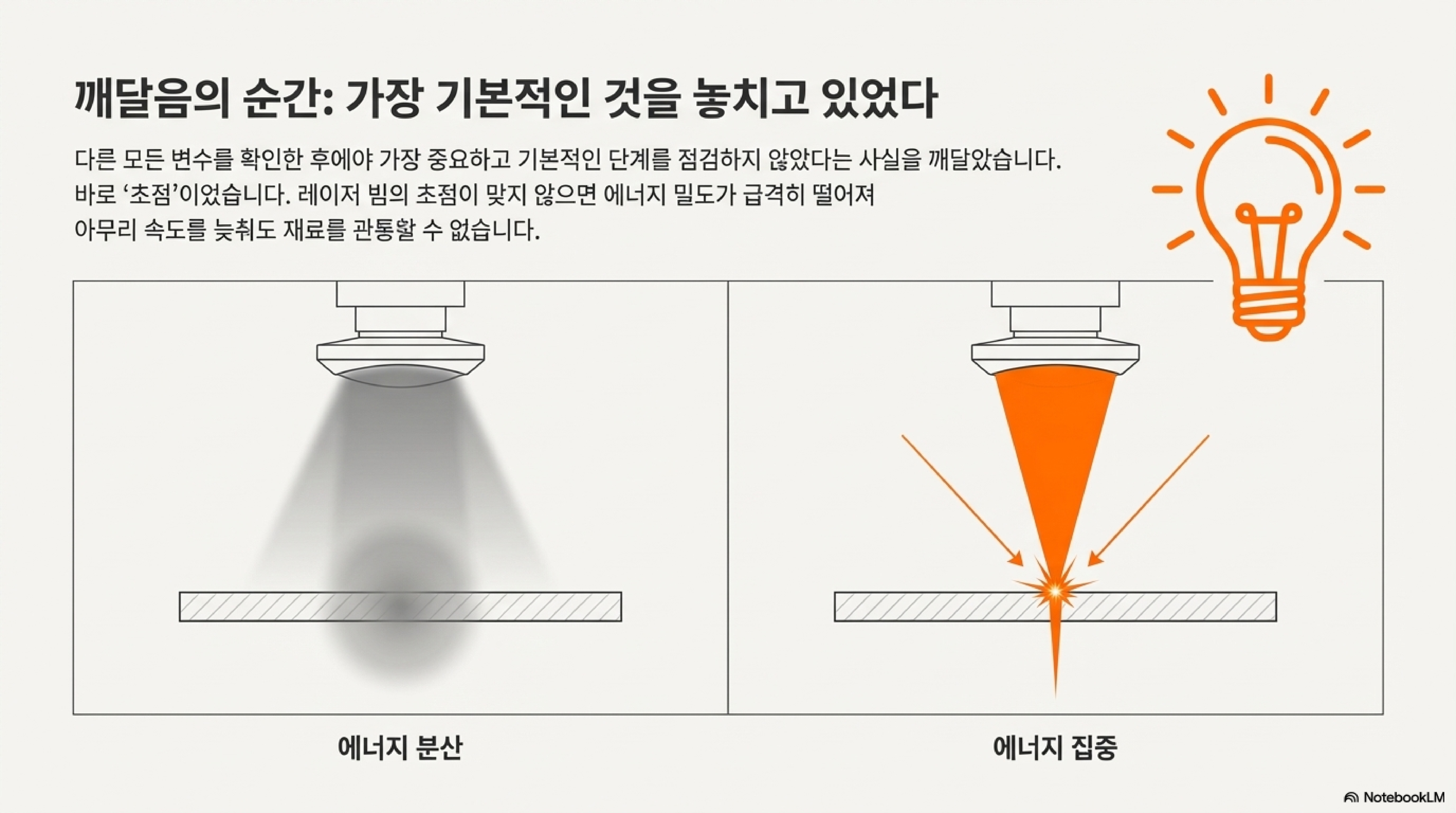 모든 변수를 확인했다고 생각했을 때, 가장 기본적이고 가장 중요한 한 가지를 놓쳤다는 것을 깨달았습니다. 바로 '초점(Focus)'이었습니다. 레이저 빔이 가장 작은 점으로 모여 에너지가 최고로 집중되는 지점을 맞추는 것은 성공적인 커팅의 가장 근본적인 조건입니다.