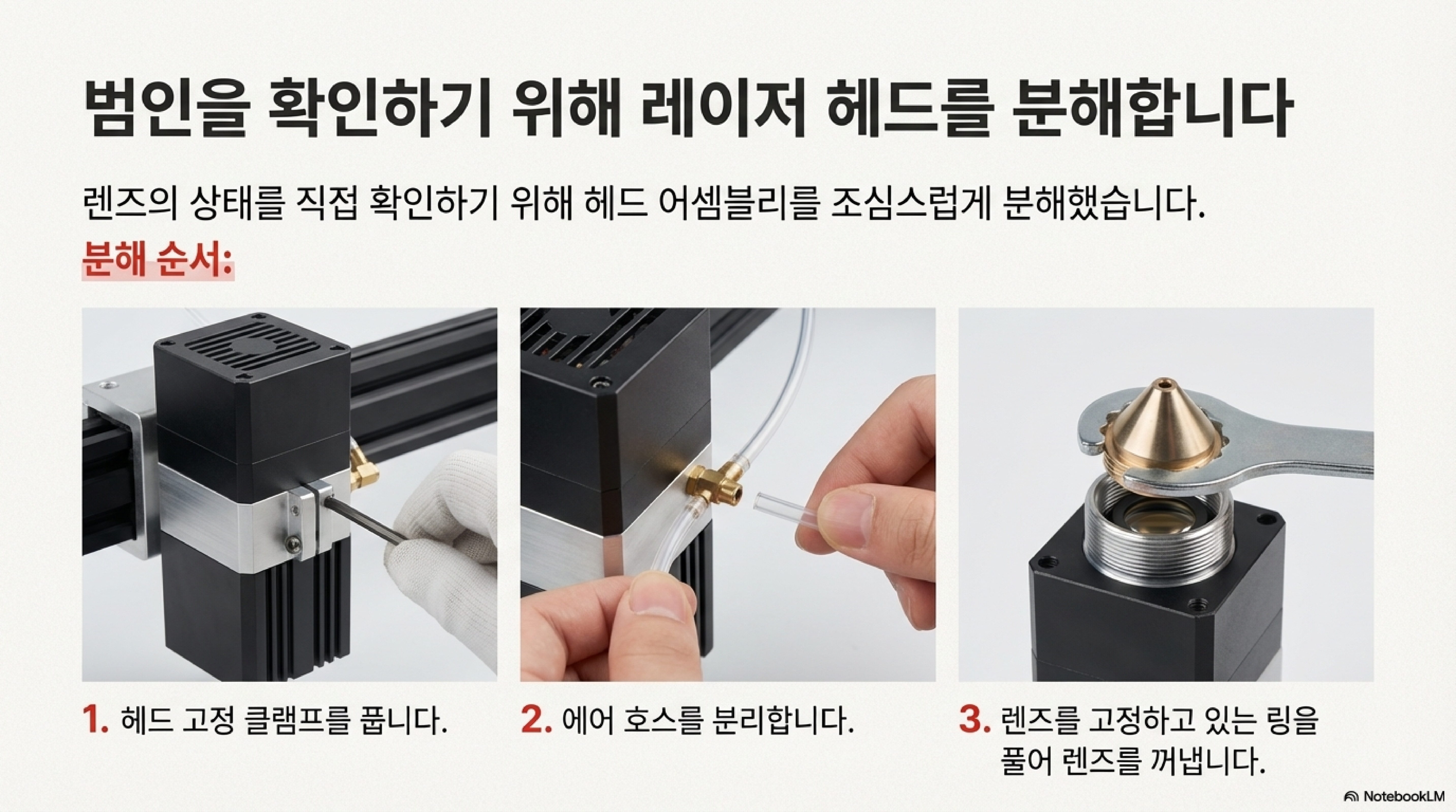 원인을 찾기 위해 렌즈를 분해하여 확인했을 때, 처음에는 아무 문제도 없어 보였습니다. 하지만 빛에 비추어 자세히 살펴보니, 눈에 거의 보이지 않는 얇은 "필름" 같은 막이 렌즈 표면을 덮고 있었습니다. 바로 이것이 레이저 출력을 절반으로 떨어뜨린 주범이었습니다.
