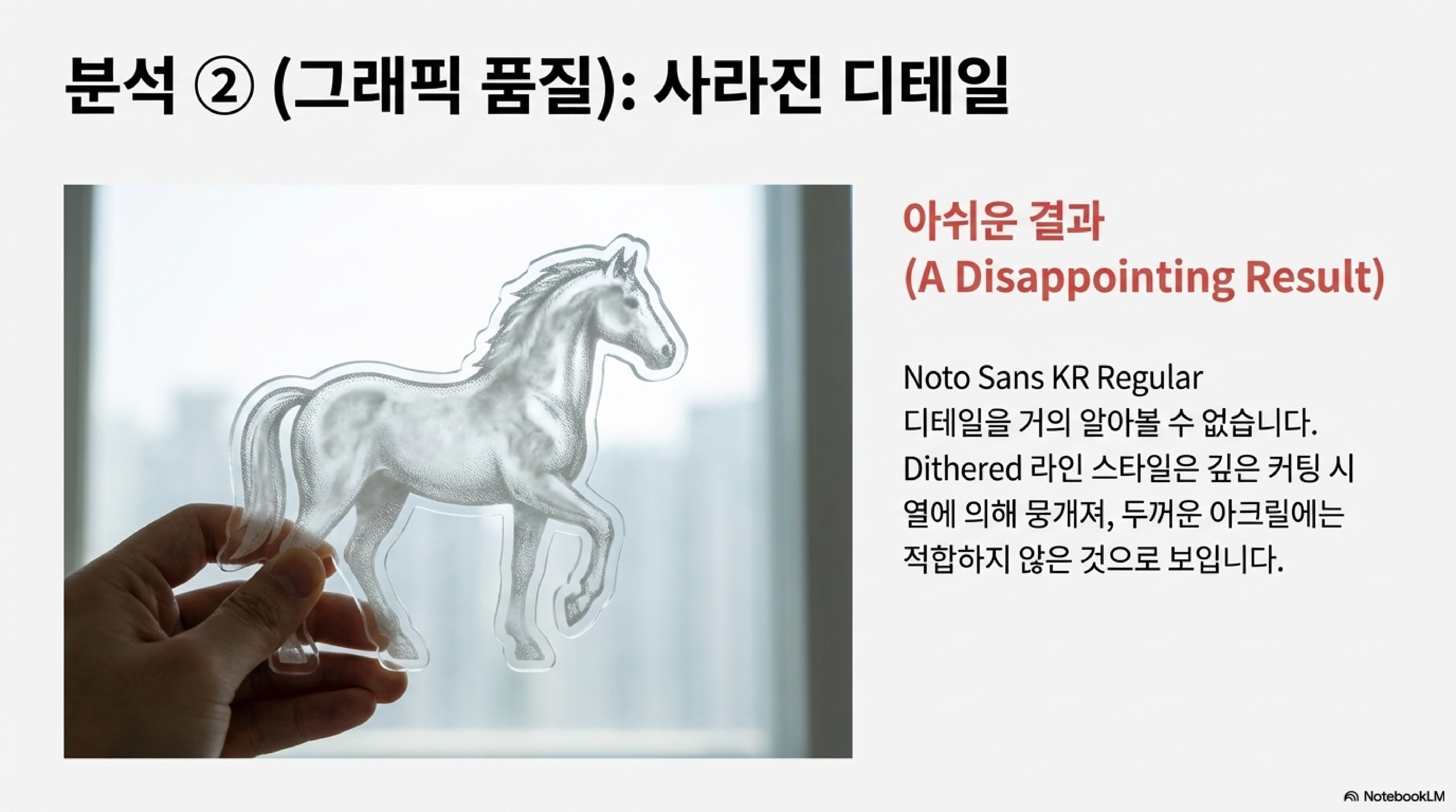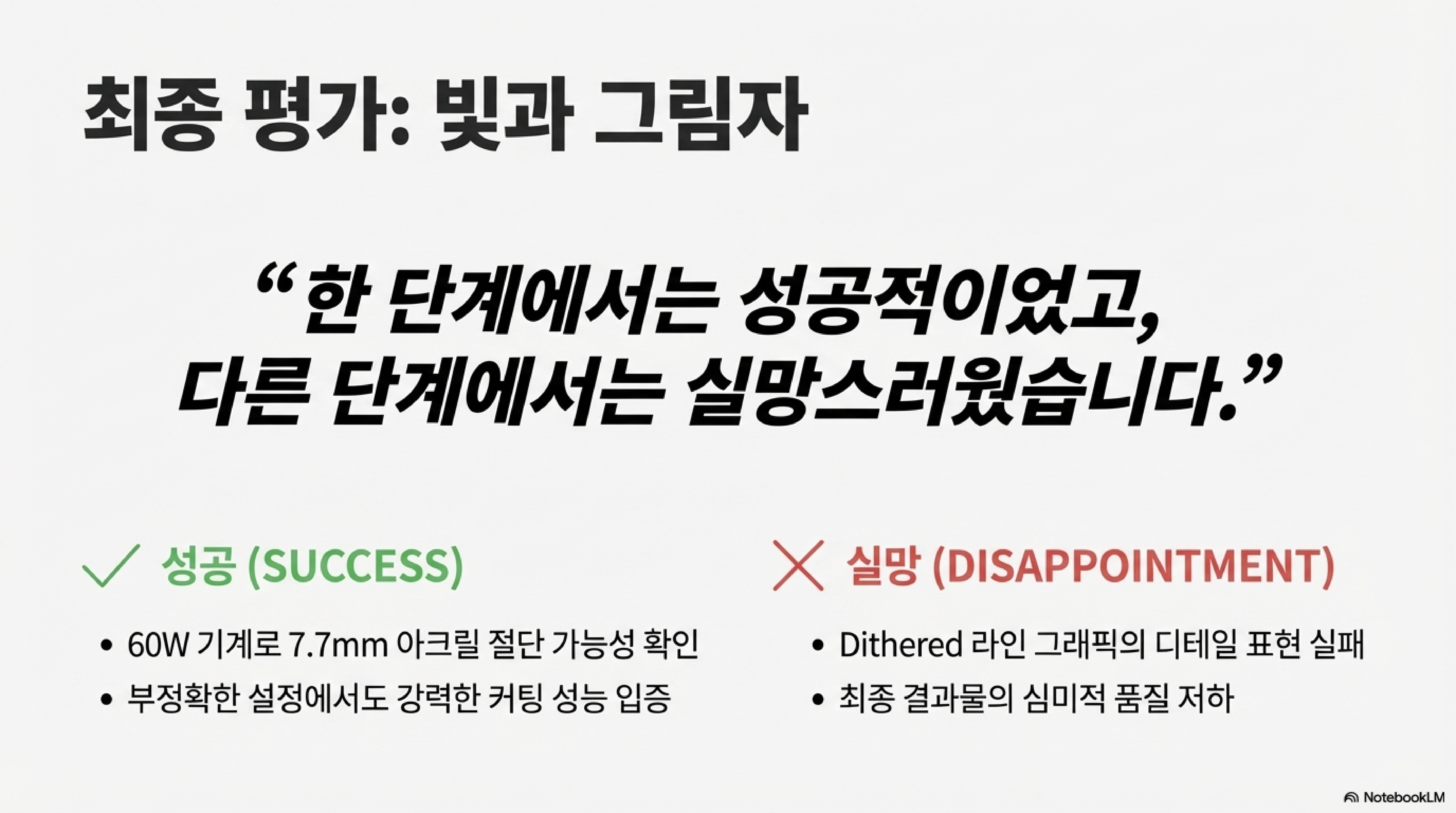 최종 결과물에 대한 감정은 복합적이었습니다. 말 모양의 형태는 성공적으로 잘라냈지만, 아크릴 위에 표현된 그래픽의 선명도는 기대에 미치지 못했습니다. 실험자의 복잡한 심경은 이 한마디에 담겨 있었습니다.