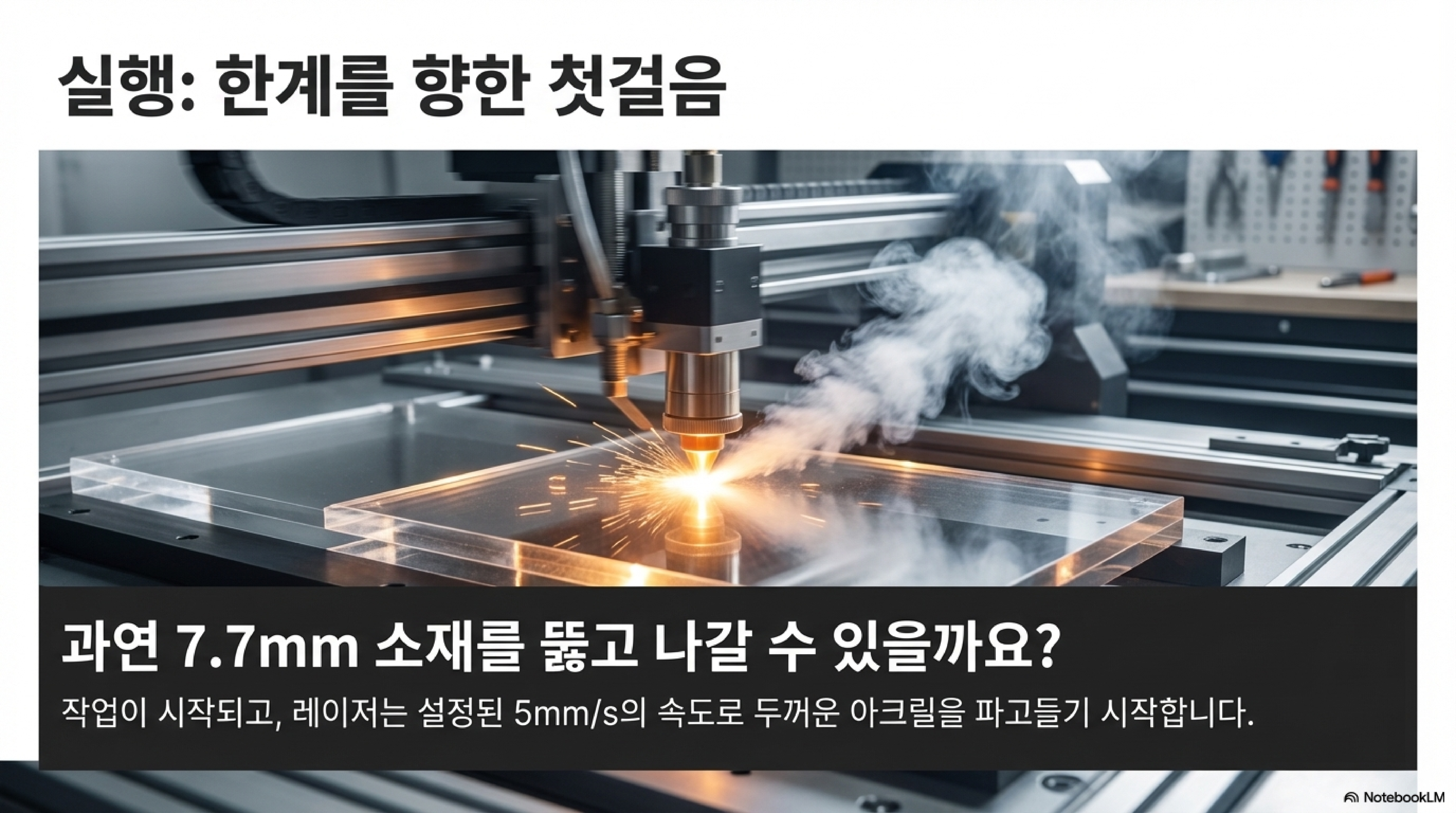 이번 실험의 핵심 과제는 7.7mm 두께의 아크릴을 자르는 것이었습니다. 이 두께는 사용하던 장비의 "절단 한계에 거의 근접한" 수준이었죠. 처음부터 성공을 장담하기 어려운 도전이었습니다.