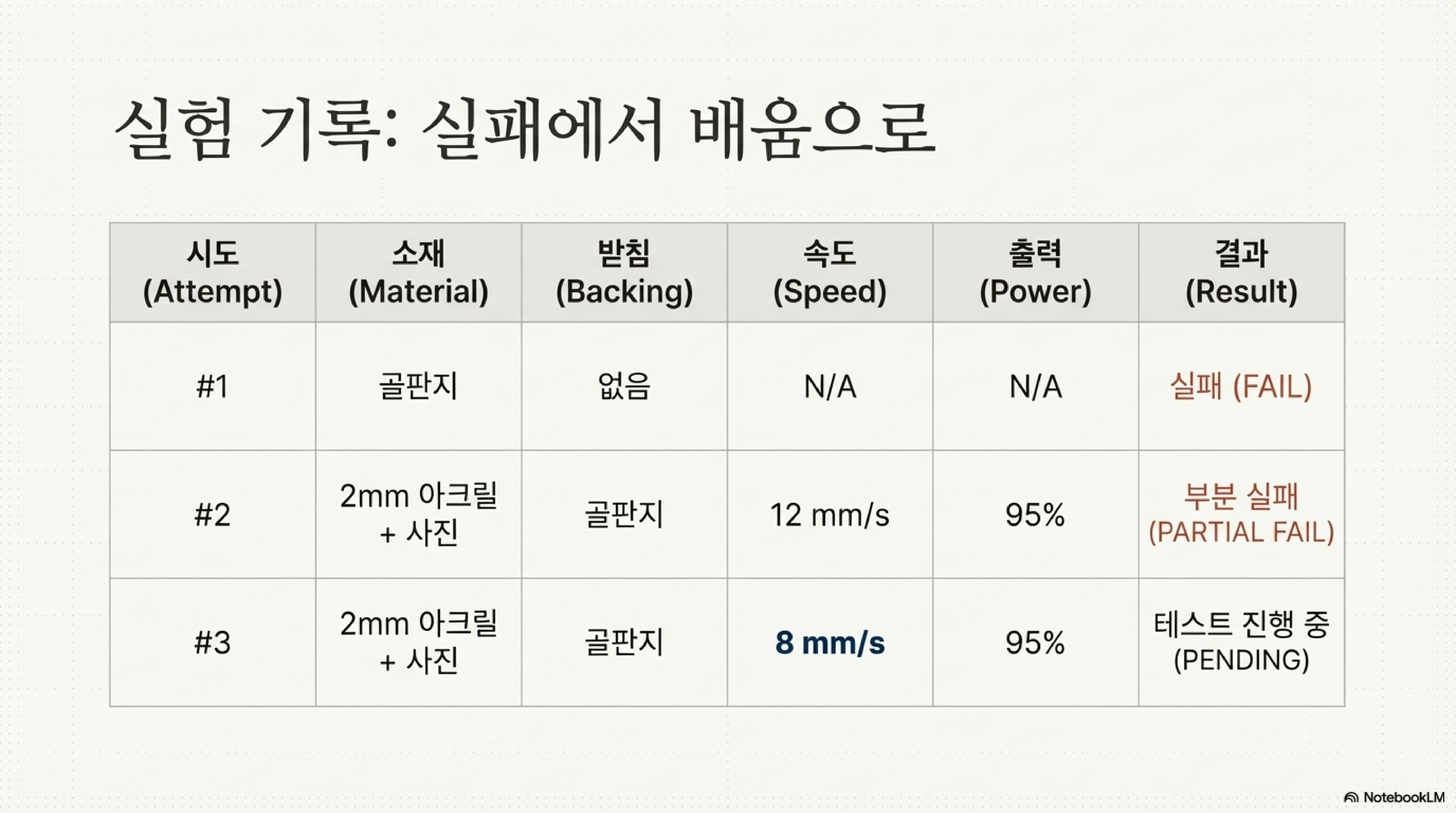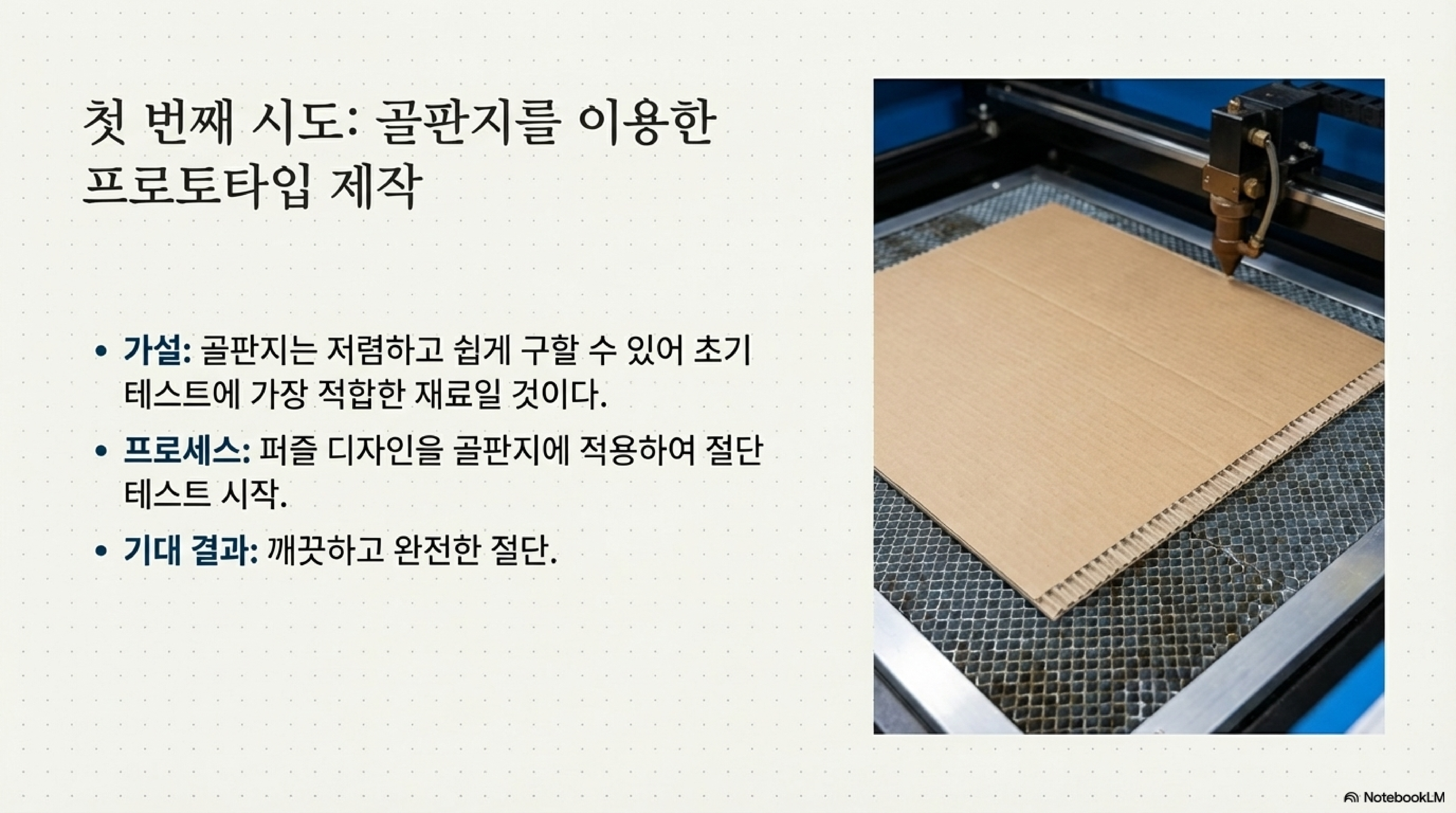 실패의 원인은 골판지의 구조에 있었습니다. 골판지는 두 장의 종이 사이에 물결 모양의 골이 있는 구조인데, 이 공기층이 문제를 일으켰습니다. 레이저가 상단부를 태우면서 발생한 연기가 이 공기층에 갇히게 되고, 갇힌 연기가 레이저 빔의 에너지를 흡수하여 빔이 하단부까지 도달하는 것을 방해했던 것입니다. 기계의 출력을 점검했지만 문제는 없었으므로, 이는 골판지 자체의 근본적인 특성이었습니다.