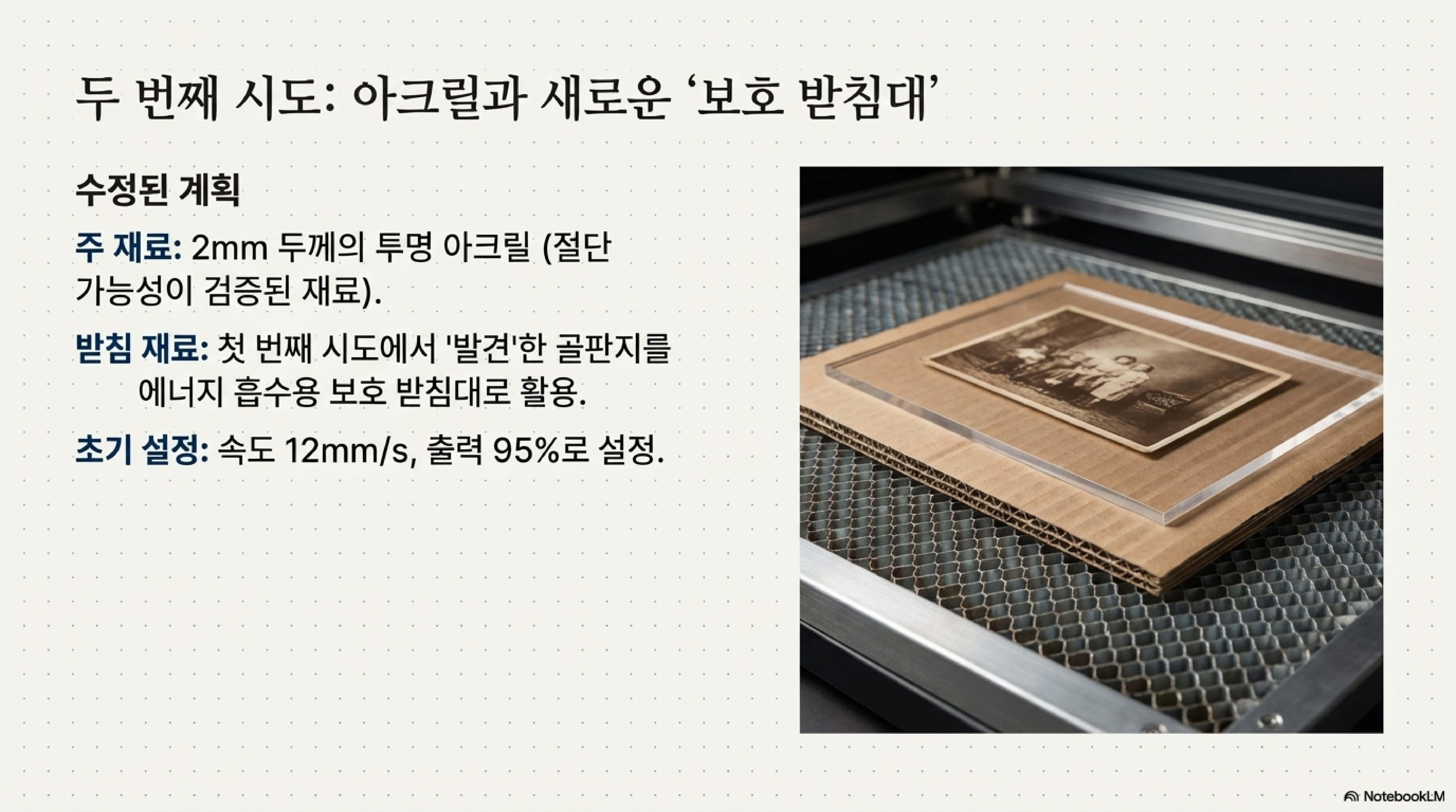 두 번째 중요한 기술적 교훈은 여러 재료를 겹쳐 사용하면 절단 특성이 크게 달라진다는 점이었습니다. 골판지를 포기하고, 사진을 2mm 두께의 아크릴판에 부착하여 퍼즐을 만들기로 했습니다.