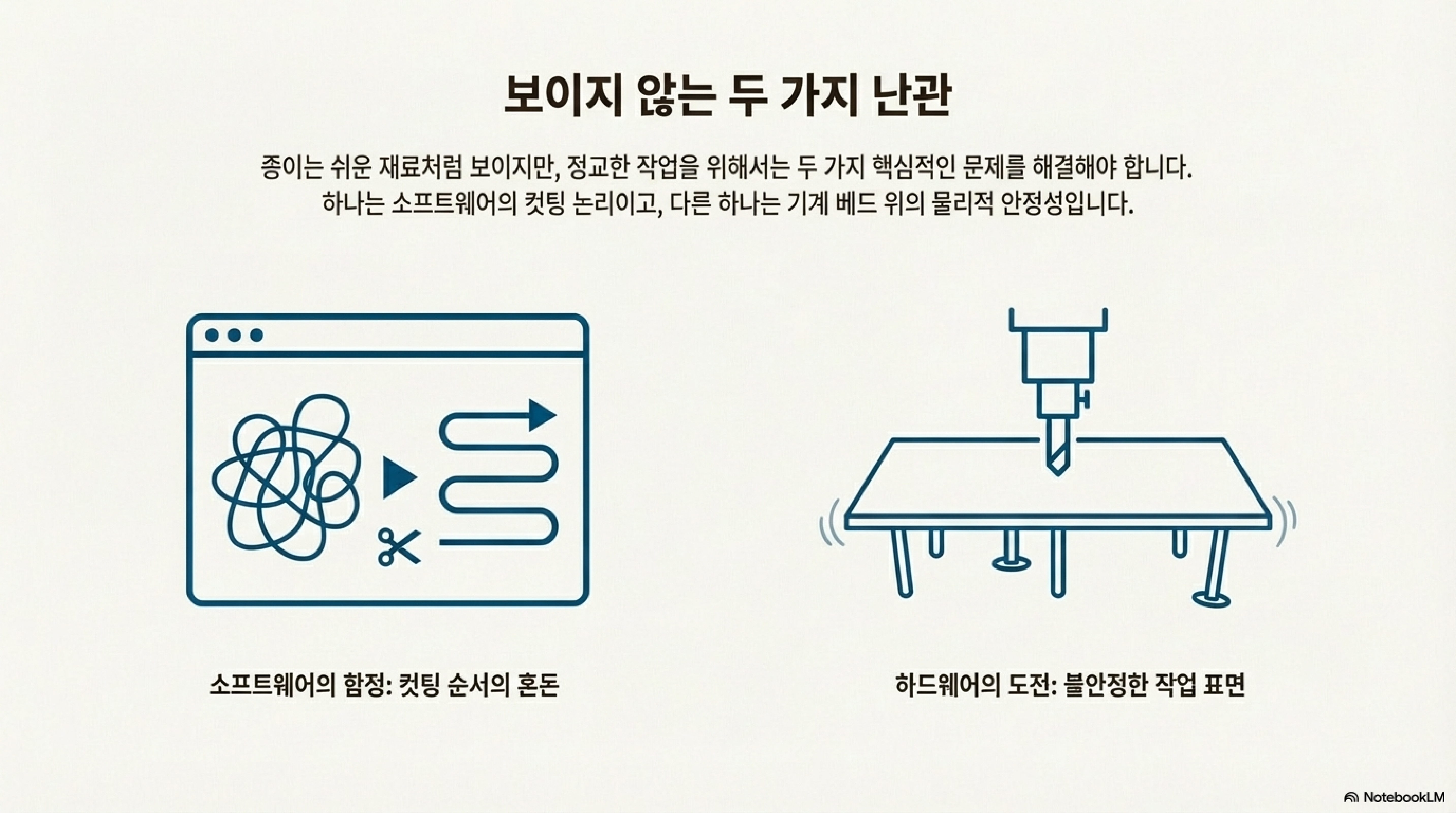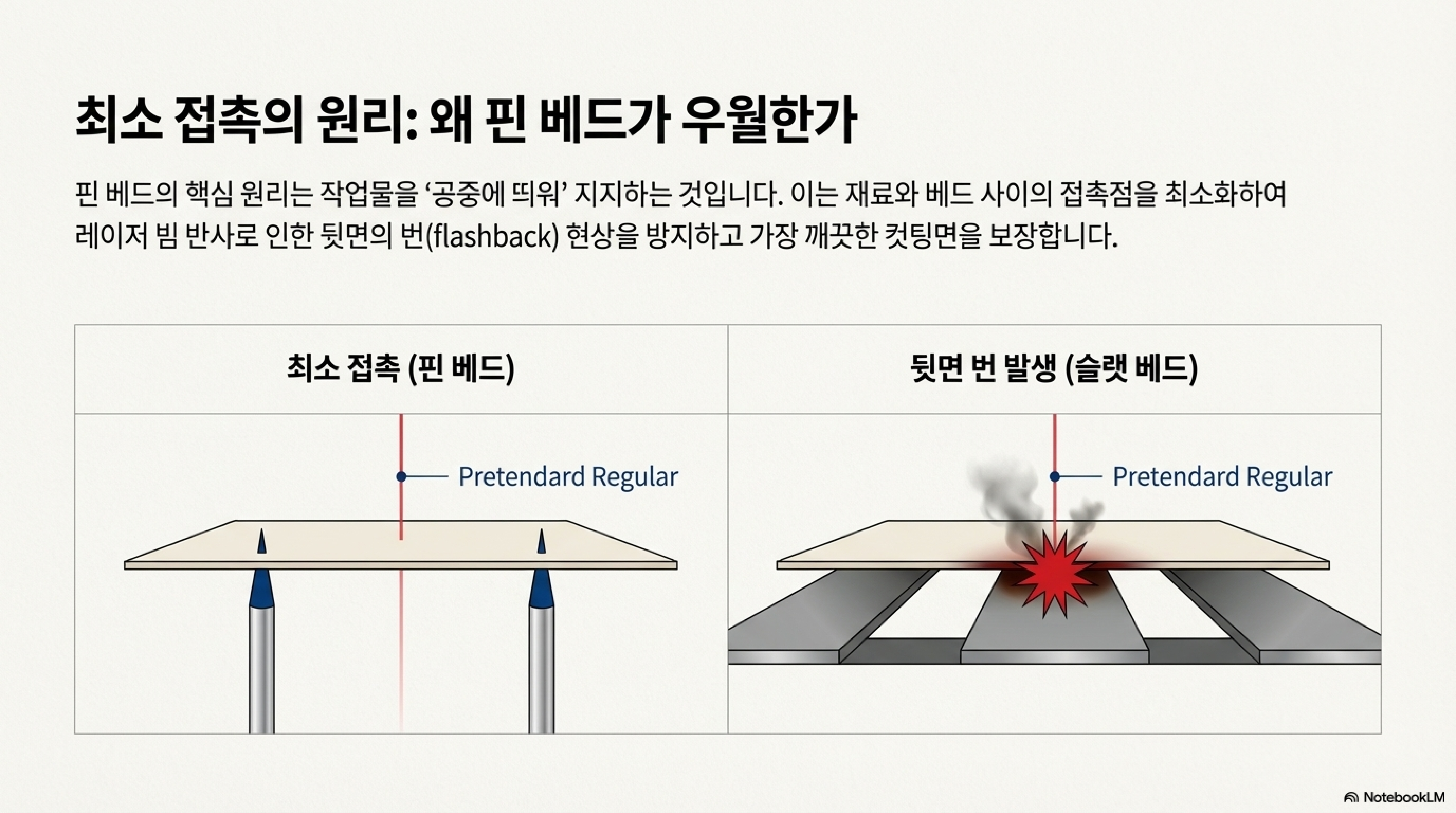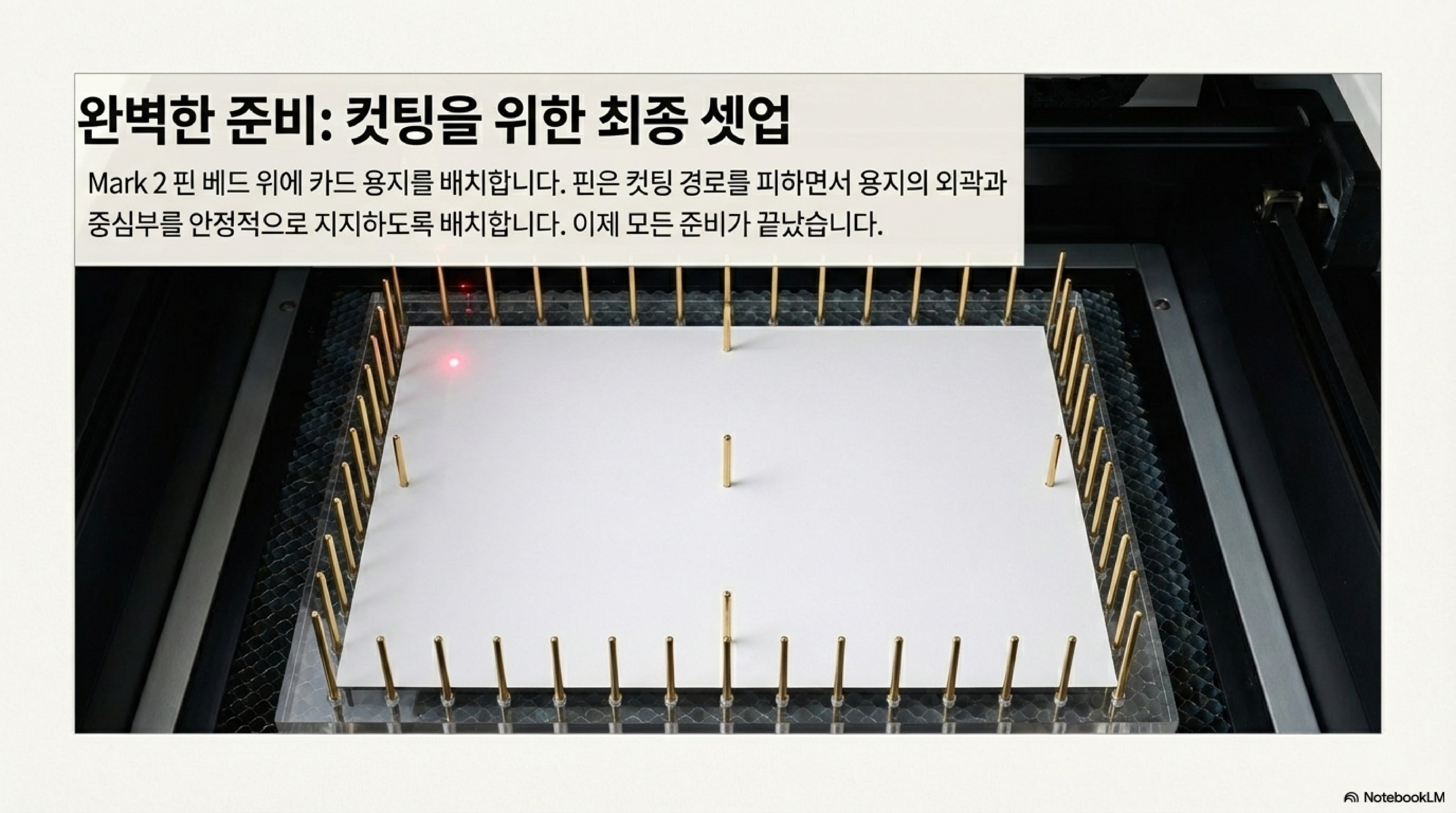 얇은 종이를 작업대 위에서 완벽하게 평평하게 유지하는 것은 매우 중요합니다. 이는 단지 레이저 반사로 인한 뒷면의 그을음을 막기 위함만이 아닙니다. 1밀리미터의 몇 분의 일이라도 높이가 달라지면 레이저의 초점 거리가 틀어져 절단 폭(kerf)이 넓어지거나 절단 품질이 저하되는 직접적인 원인이 됩니다.