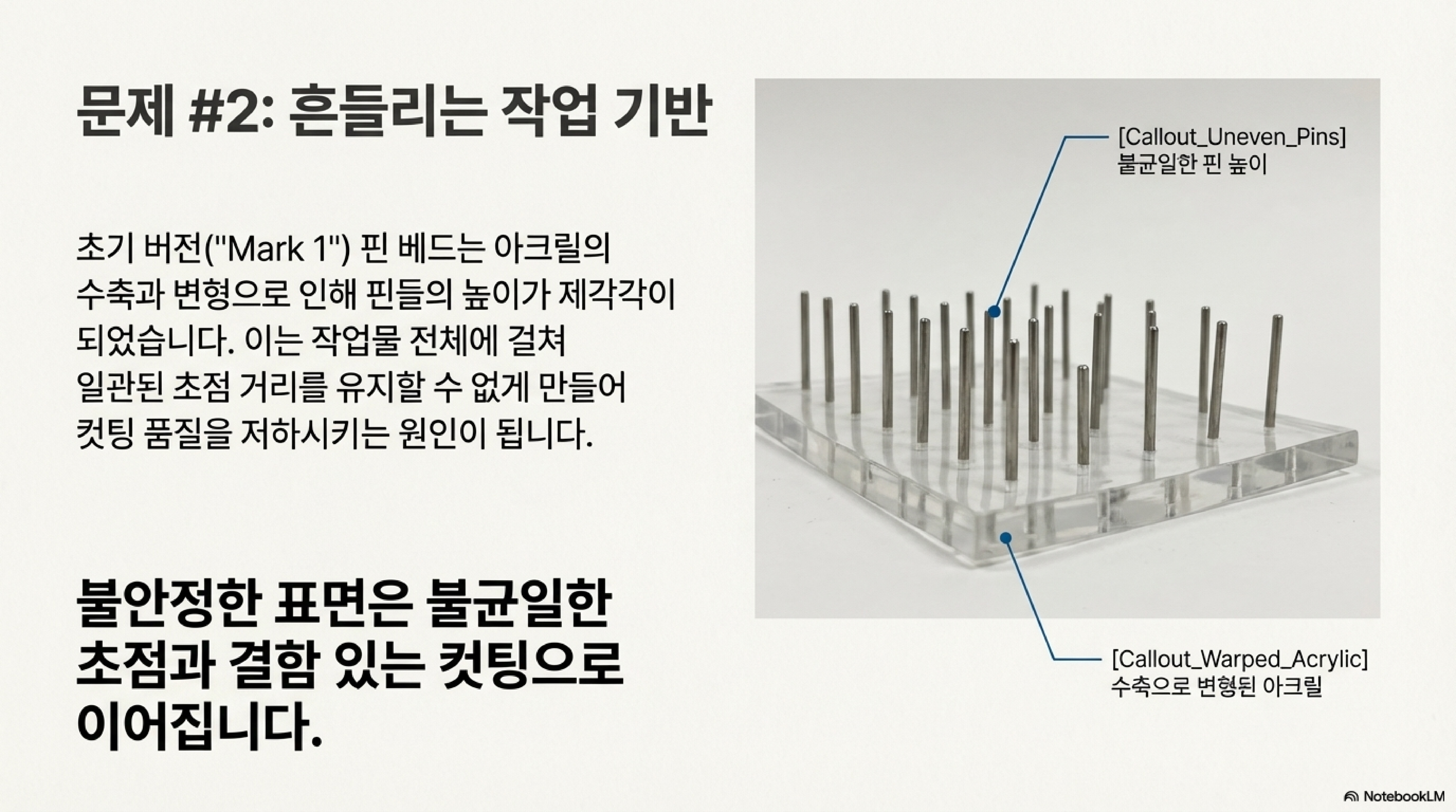 이 시스템이 뛰어난 이유는 모든 핀의 길이가 정확히 같고, 절대적으로 평평한 강철 기준판 위에 놓여있기 때문에 핀들이 만들어내는 지지 표면이 완벽하게 수평을 이룬다는 점입니다.