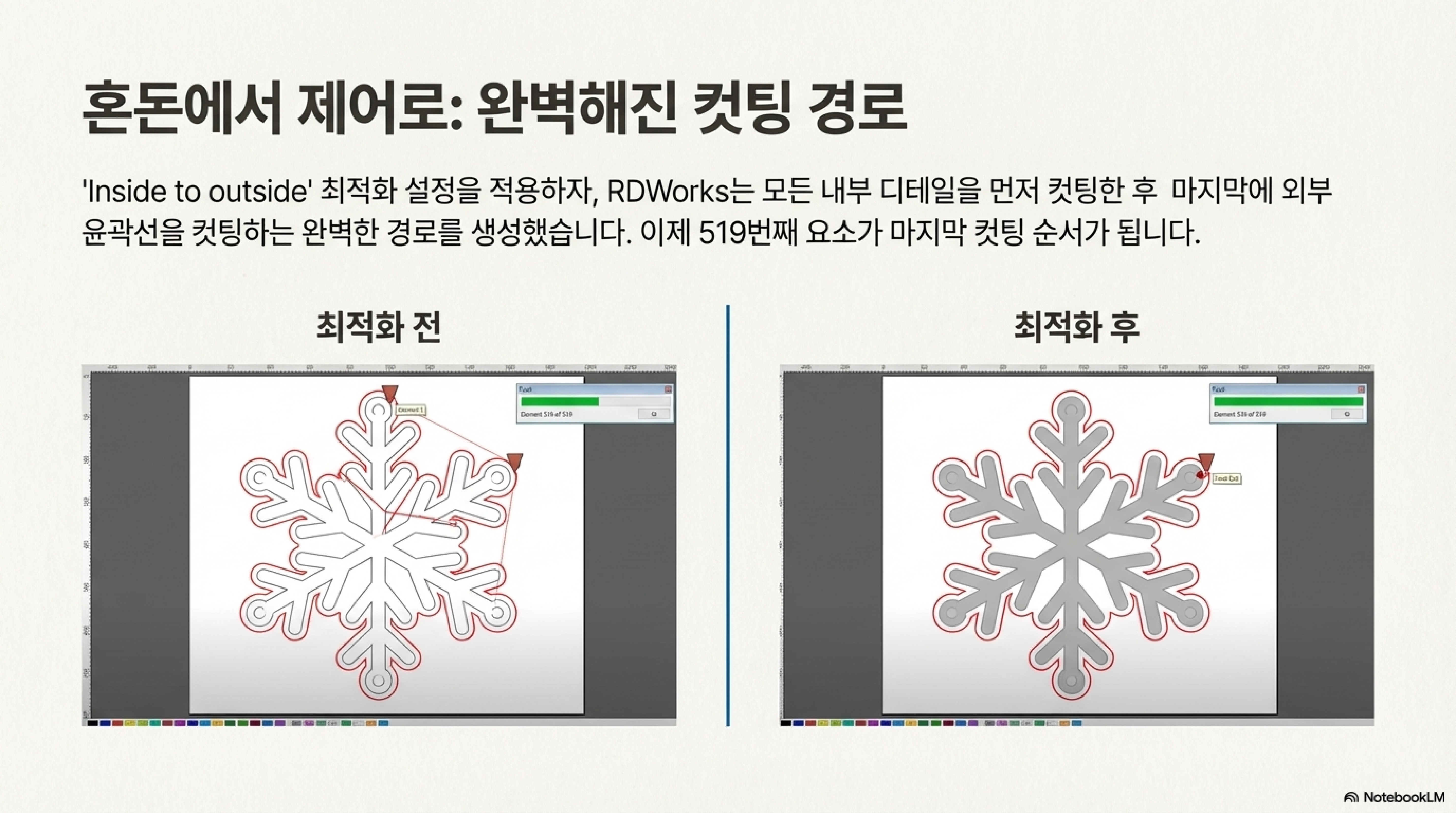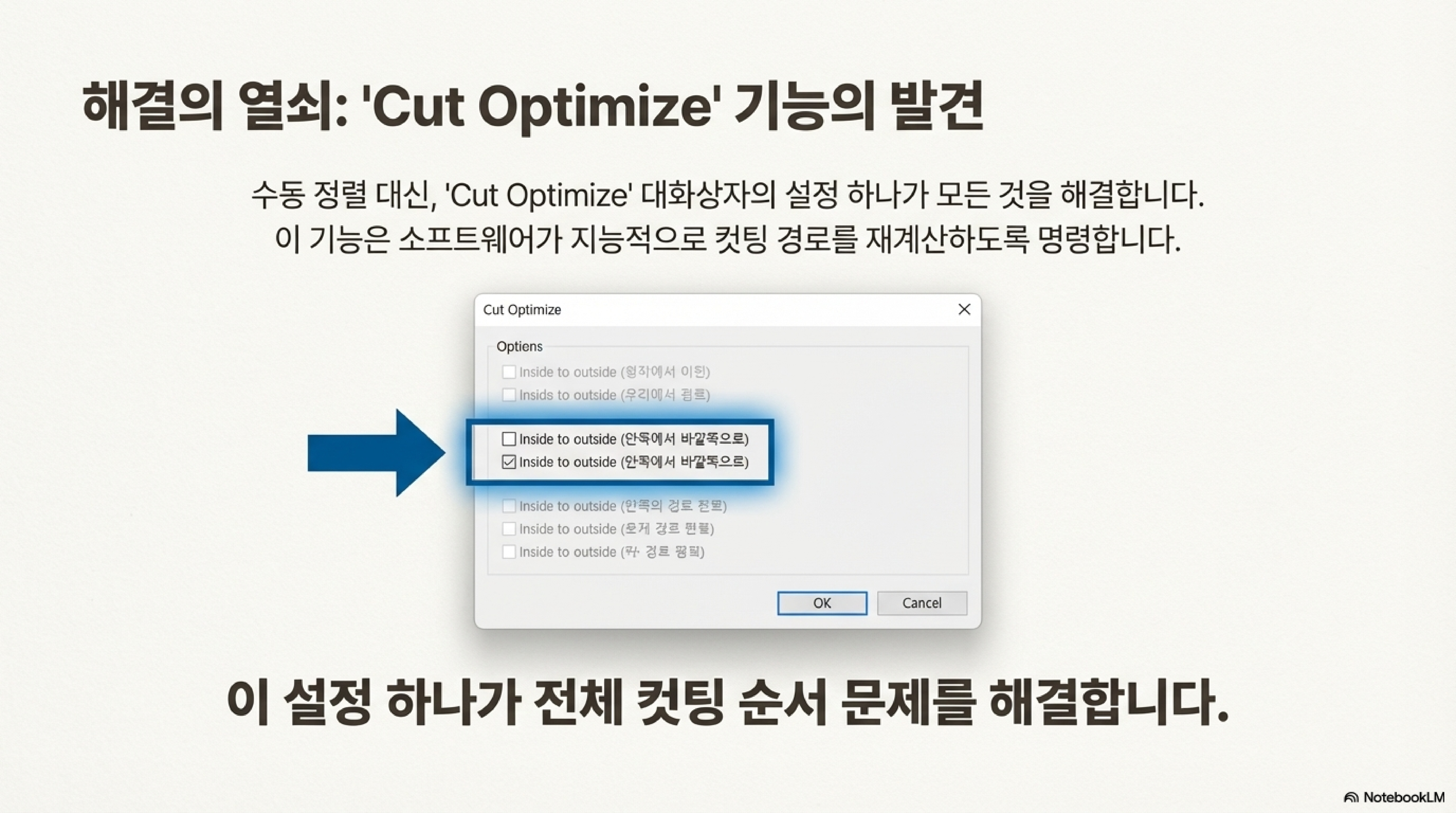 진짜 해결책은 바로 별도의 '절단 최적화(Cut Optimize)' 설정에 숨어있습니다. 이 기능은 단순한 목록 순서를 넘어, 소프트웨어에 논리적 규칙을 적용하는 상위 레벨의 명령어입니다. 사용자가 수동으로 정렬한 목록을 완전히 무시하고 우선적으로 적용될 수 있는 이유가 바로 여기에 있습니다. 실제로 '안쪽에서 바깥쪽으로(inside to outside)' 옵션을 활성화하자, 소프트웨어는 519개의 요소 중 외부 윤곽선인 마지막 경로를 제외한 518개의 내부 경로를 먼저 처리하도록 전체 순서를 자동으로, 그리고 완벽하게 재배치했습니다.