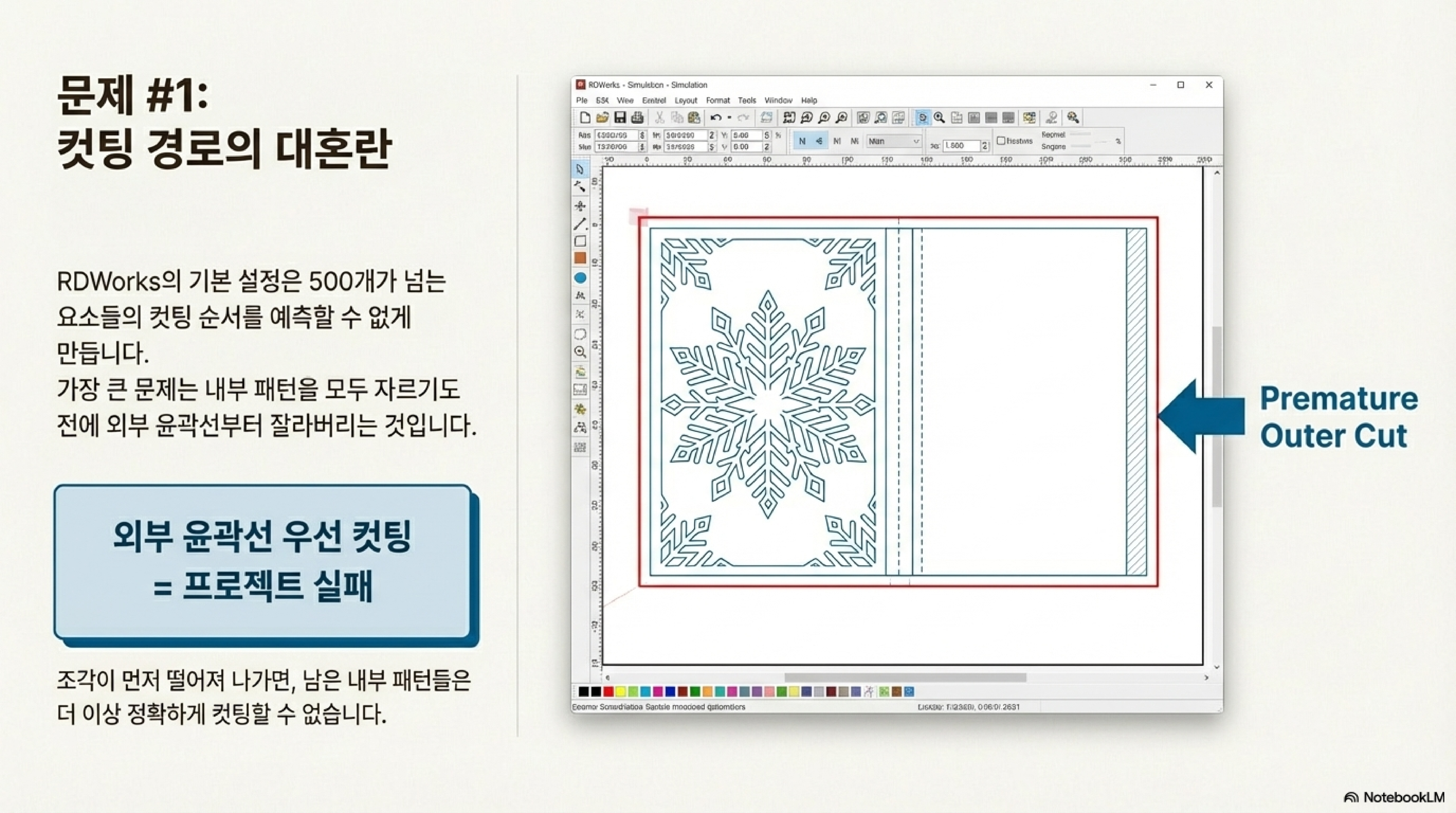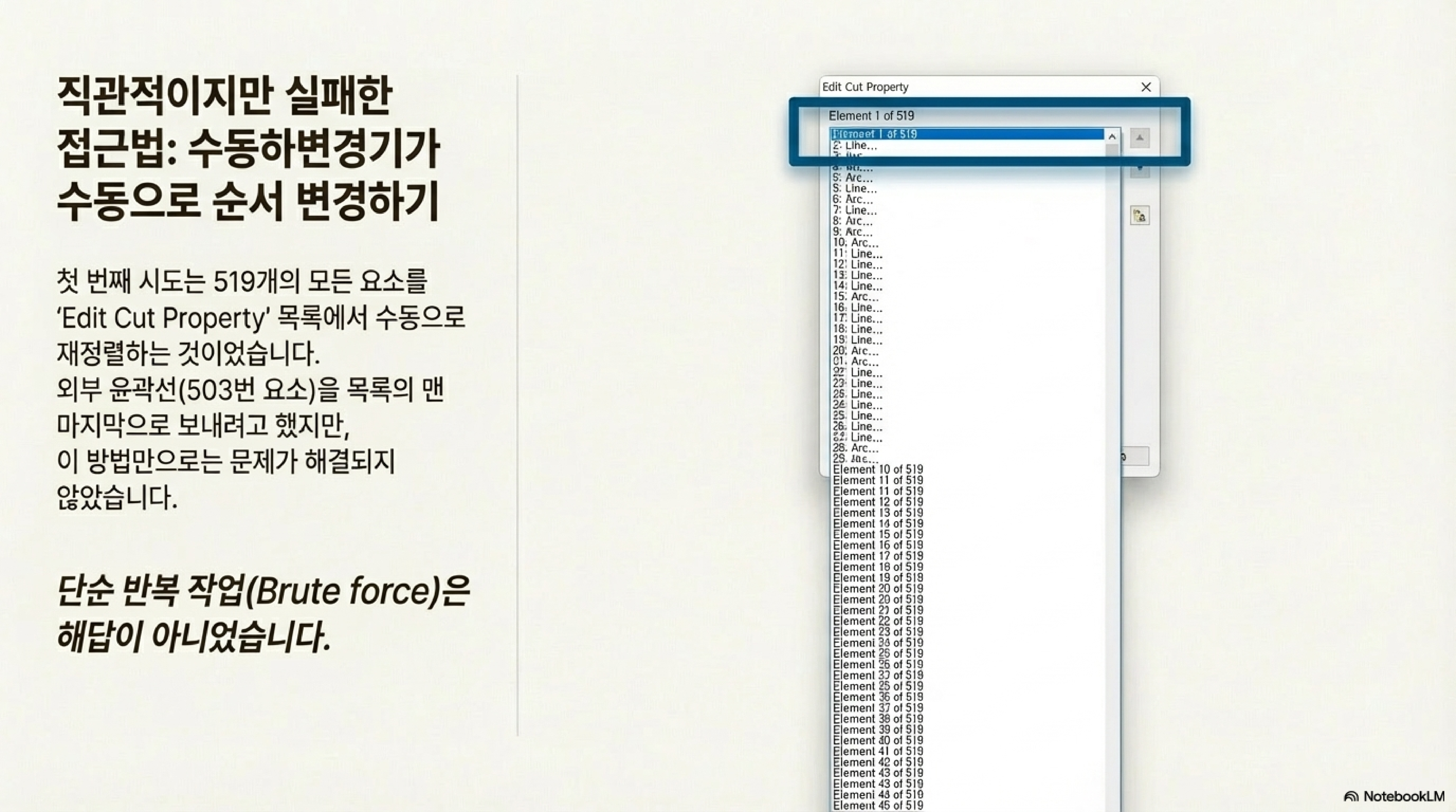 직관적인 해결책은 소프트웨어의 '절단 속성 편집' 목록에서 수백 개에 달하는 절단 경로를 수동으로 재정렬하여 외부 경로를 맨 마지막으로 옮기는 것입니다. 하지만 수백 개의 경로를 하나씩 끌어다 놓는 작업은 극도의 인내심을 요구할 뿐만 아니라, 단 한 번의 실수로 전체 순서가 뒤엉킬 수 있는 고된 과정입니다.