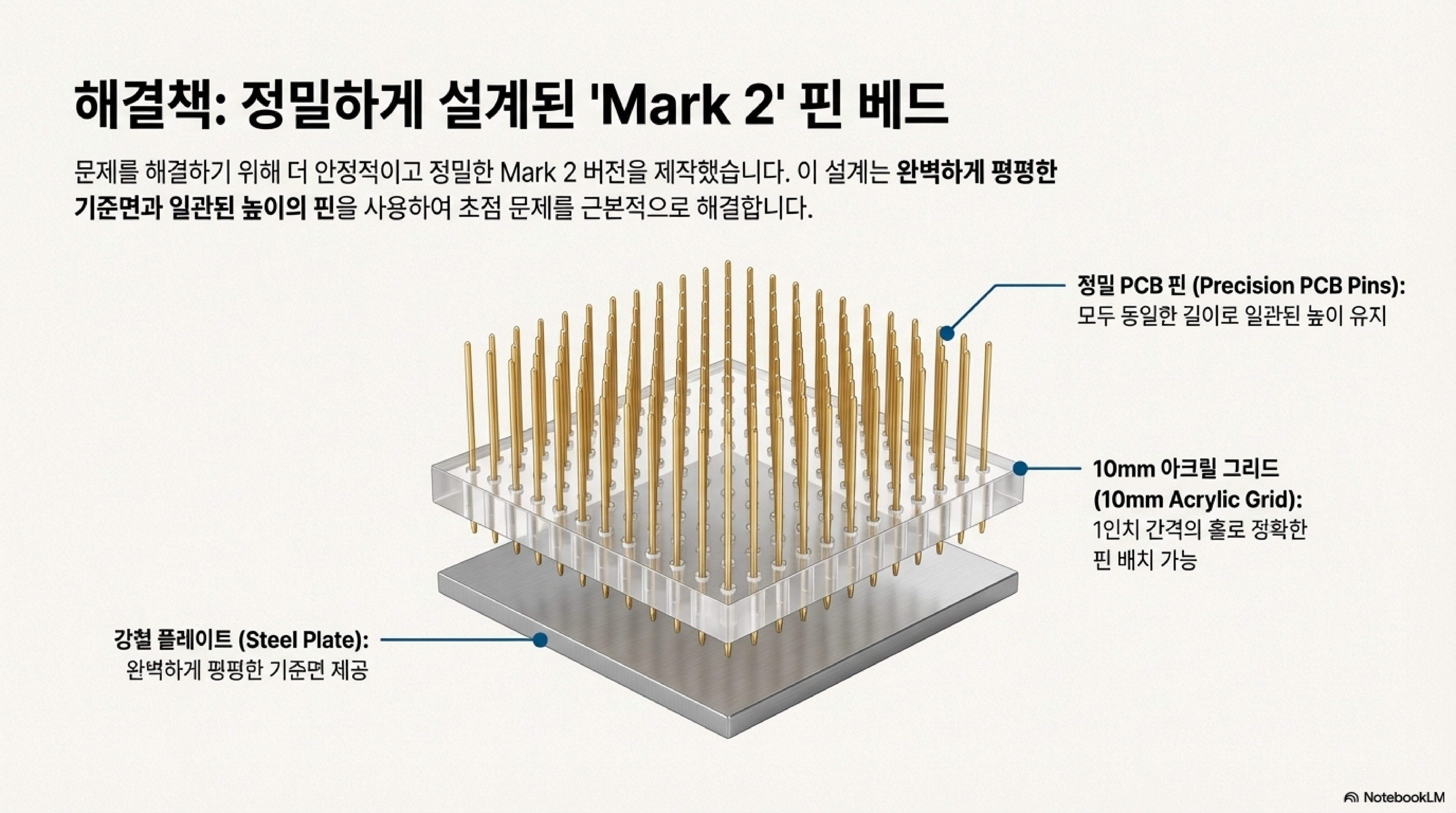이를 해결하기 위해 그는 정밀 공학에 기반한 'Mark 2' 버전을 제작했습니다. 이 시스템은 정밀하게 가공된 16게이지 두께의 강철판을 완벽한 기준 데이텀(reference datum)으로 삼고, 그 위에 10mm 두께의 아크릴 격자를 올렸습니다. 그리고 인쇄 회로 기판(PCB) 테스트용으로 사용되던 동일한 길이의 금도금 핀들을 꽂아 사용했습니다.