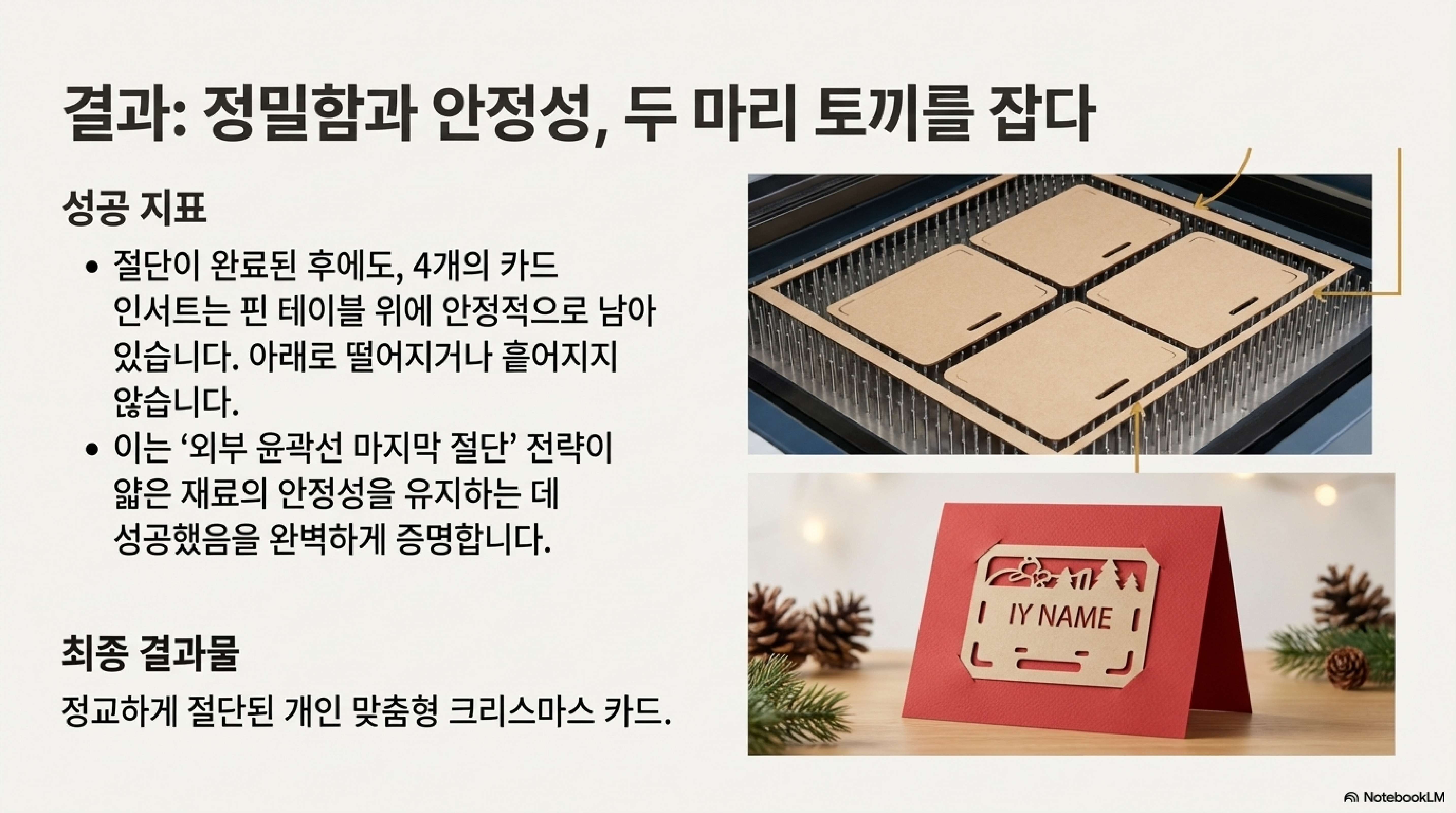 정교한 기계가 명백한 지시를 따르지 않을 때 메이커들이 겪는 답답함은 누구나 공감할 것입니다. 재료와 시간을 절약하기 위해 완벽한 절단 순서를 세심하게 계획했지만, 기계는 제멋대로 움직입니다. 이 문제는 얇은 A4 용지 한 장에서 네 개의 섬세한 크리스마스 카드 속지를 만드는 프로젝트를 진행하던 중 발생했습니다. 종이의 구조적 안정성을 마지막 순간까지 유지하려면 절단 순서가 무엇보다 중요했습니다. 하지만 이 간단한 목표는 RDWorks의 혼란스러운 경로 제어 세계를 깊이 파고드는 계기가 되었고, 그 과정에서 몇 가지 놀라운 발견을 하게 되었습니다.